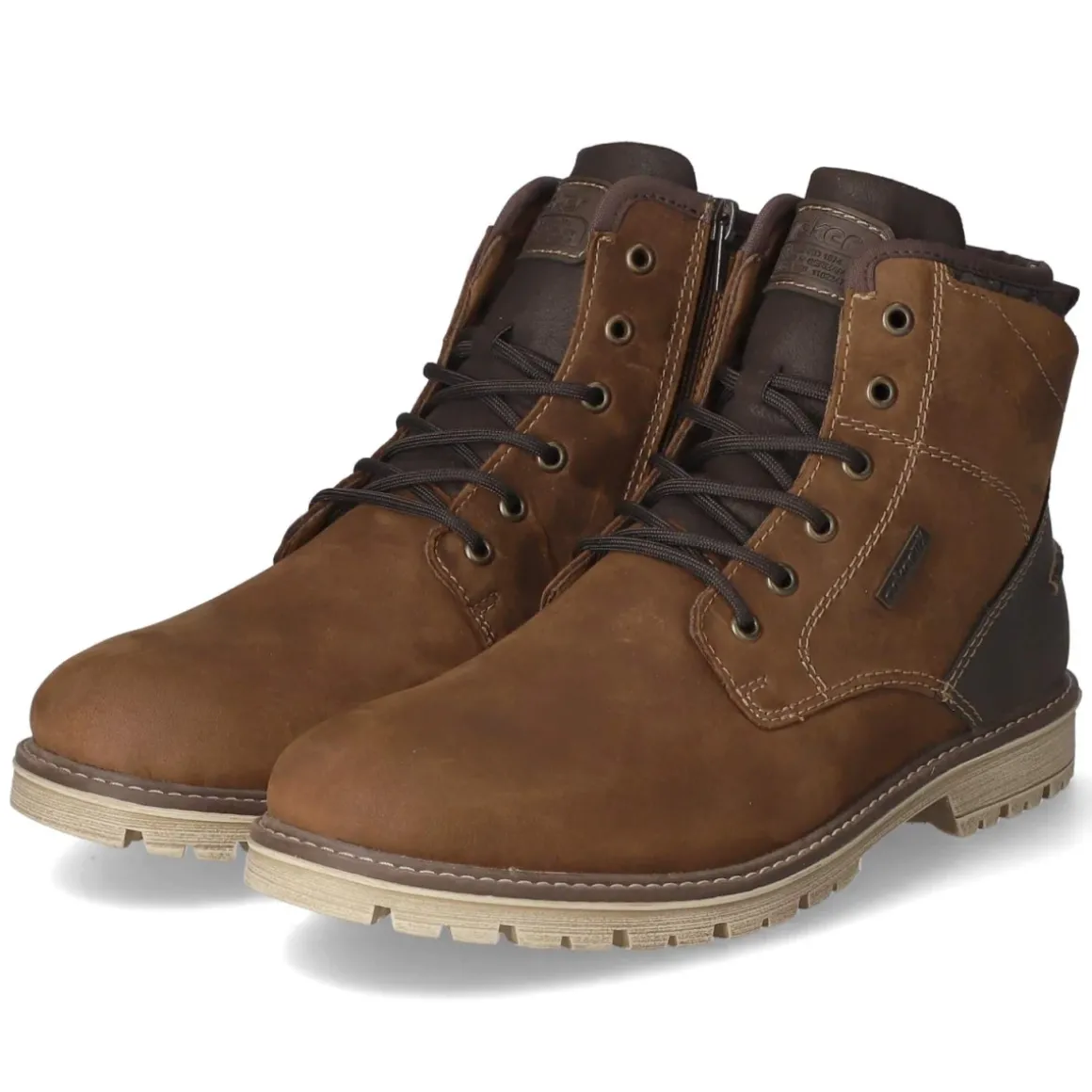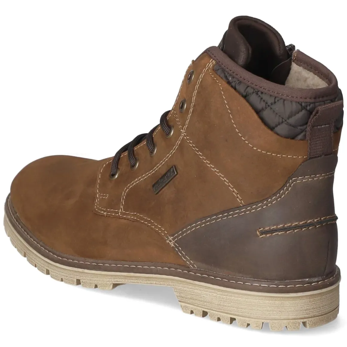Der Herren-Winterboot von Rieker vereint robustes Design und hohen Tragekomfort. Das Obermaterial aus Leder und Synthetik zeigt sich in warmem Braun und wird von markanten Ziernähten und TEX-Markendetails akzentuiert. Dank wasserfester, zugleich atmungsaktiver Ausstattung sowie wasserabweisender Oberfläche bleiben Füße auch an nassen Tagen angenehm trocken. Ein kuscheliges Warmfutter und eine textile Decksohle sorgen für behagliche Wärme, während die verstärkte Ferse Stabilität bietet. Die runde Spitze, eine flexible, rutschhemmende Profilsohle und die Kombination aus Schnürung und zusätzlichem Reißverschluss erleichtern den Alltag bei winterlichen Bedingungen. Mit Anziehlasche gelingt der Einstieg noch leichter. Die Passform fällt normal aus und eignet sich damit verlässlich für den täglichen Einsatz. Modetipp: Zu dunklem Denim, Wollsocken und Parka getragen entsteht ein zeitloser, urbaner Winter-Look.