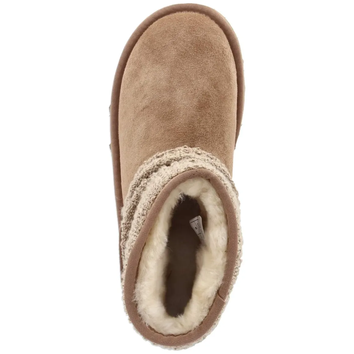 Winterboots FAME von Australia Luxe setzen in Braun auf kuschlige Wärme und moderne Linie. Der robuste Material-Mix aus Leder und Textil trifft auf ein weiches Lammfellfutter, das gemeinsam mit der Textildecksohle für spürbaren Wohlfühlfaktor sorgt. Die starke, leichte Plateausohle mit 4,5 cm Höhe gibt neuen Stand, während runde Spitze und das Design ohne Verschluss unkomplizierte Eleganz liefern. Markante Nähte, die verstärkte Ferse mit Metall-Label sowie der gepolsterte Einstieg mit Umschlagkrempe und Lederpatch in Strickoptik runden den Look ab. Das Modell fällt normal aus und begleitet mühelos durch kalte Tage. Modetipp: Besonders stimmig zu wadenlangen Strickkleidern und Oversize-Mänteln, dazu gerippte Socken, die dezent über den Schaft blitzen.