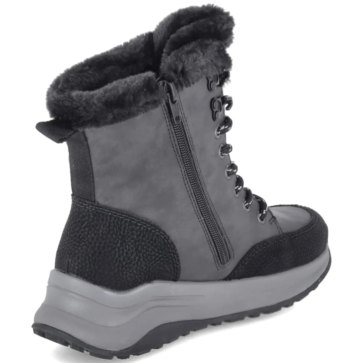 Der Winterboot von Rieker setzt auf funktionalen Komfort und sportliche Lässigkeit. Das wasserfeste Obermaterial aus pflegeleichtem Kunstleder schützt zuverlässig vor Nässe, während das Warmfutter wohltuende Isolation bietet. Die Kombination aus Schnürung und zusätzlichem Reißverschluss erleichtert den Einstieg, unterstützt von Anziehlasche und weichem Schaft mit Kunstfellkrempe. Ein komfortables Wechselfußbett mit textiler Decksohle sorgt für angenehme Dämpfung, die flexible, rutschfeste Profilsohle liefert Grip auf winterlichen Wegen. Runde Schuhspitze sowie verstärkter Fersen- und Zehenbereich erhöhen den Tragekomfort und die Robustheit. Das graue Design fügt sich mühelos in Alltagslooks ein. Das Modell fällt schmal aus; eine Nummer größer empfiehlt sich. Modetipp: Mit Wollsocken, Strickrock und Oversize-Steppjacke entsteht ein stimmiger City-Winterlook.