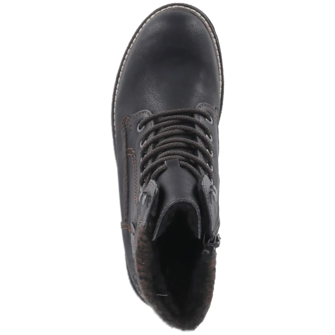 Der Winter kann kommen: Die Rieker Winterboots für Damen kombinieren funktionale Stärke mit stilvollem Auftritt. Schwarzes Kunstleder mit dezenten Ziernähten und einer gemütlichen Strickkrempe umrahmt den Schaft, während warmes Futter und ein gepolstertes, herausnehmbares Fußbett für wohligen Komfort sorgen. Das wasserfeste, wasserabweisende Obermaterial schützt zuverlässig bei nassem Wetter, die rutschfeste, kräftig profilierte Sohle gibt Halt auf glatten Wegen. Schnürung und zusätzlicher Reißverschluss ermöglichen eine individuell anliegende Passform und bequemes An- und Ausziehen. Der 4 cm hohe Blockabsatz stabilisiert, die runde Spitze bietet Zehenfreiheit. Die Passform fällt normal aus und trifft damit den Alltagsbedarf von Erwachsenen, die Wert auf Wärme, Leichtigkeit und Eleganz legen. Modetipp: Mit slim geschnittener Jeans, Grobstrickpullover und einem Wollmantel in Kamel setzt der Boot einen urbanen Akzent.