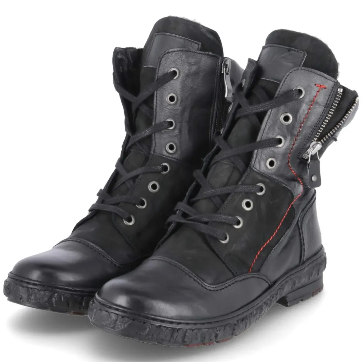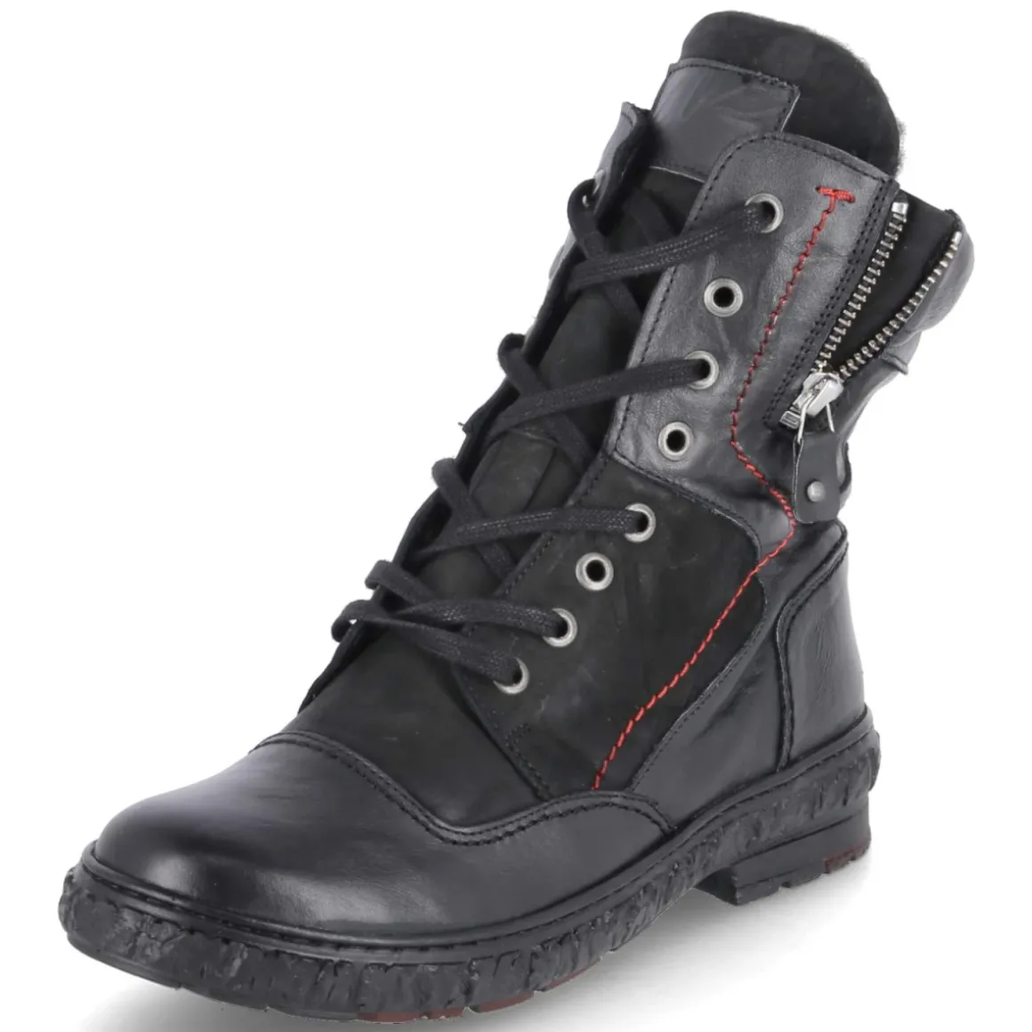 Der Winterboot von Krisbut vereint robuste Funktion und zeitloses Design. Schwarzes Glattleder mit Zehen- und Fersenkappe sorgt für Strapazierfähigkeit, während Warmfutter und die textile Decksohle angenehme Wärme an kalten Tagen bieten. Durch die Kombination aus Schnürung und seitlichem Reißverschluss gelingt der Einstieg bequem und der Sitz präzise. Ein 3 cm hoher Blockabsatz und die flexible Profilsohle gewährleisten sicheren Halt auf winterlichen Wegen. Die runde Schuhspitze und der gepolsterte Schaftrand erhöhen den Tragekomfort, das gepolsterte Wechselfußbett unterstützt zusätzlich und lässt sich bei Bedarf austauschen. Mit seinem relaxten Leichtgewicht-Charakter fällt das Modell normal aus und begleitet zuverlässig durch den Alltag. Modetipp: Zu einem langen Wollmantel, Strickkleid und Thermoleggings entsteht ein eleganter City-Look, der mit einem groben Schal harmonisch abgerundet wird.