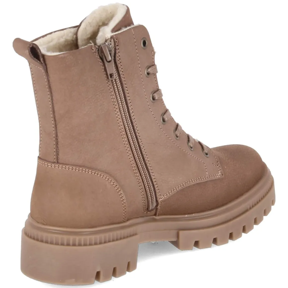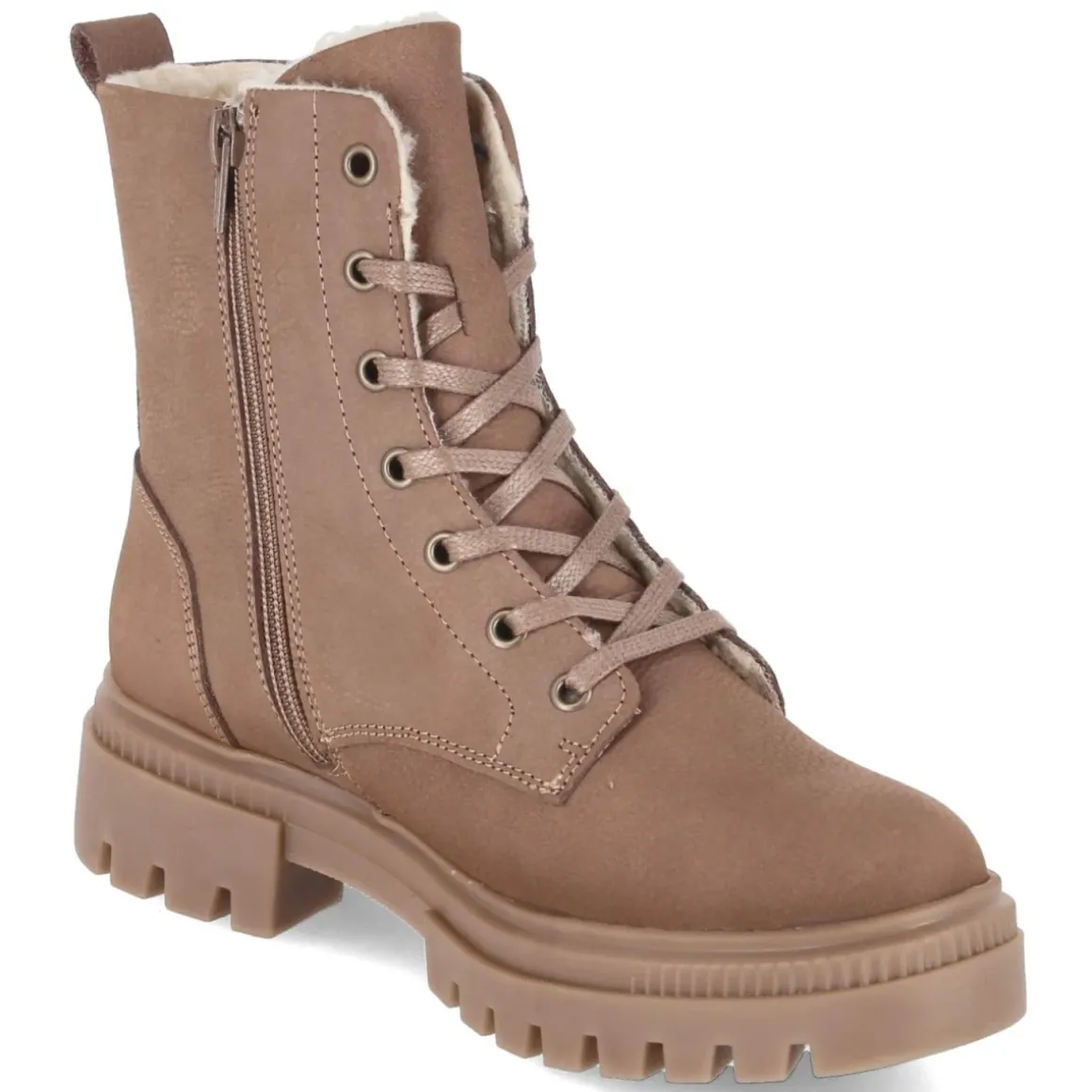 Die Bullboxer Winterboots in edlem Taupe verbinden zuverlässige Wärme mit urbanem Stil. Das Obermaterial aus langlebigem Rauleder schmiegt sich soft an den Fuß, die runde Spitze sorgt für komfortablen Zehenraum und das warme Futter hält auch an frostigen Tagen zuverlässig die Temperatur. Dank normal ausfallender Passform sitzt der Schuh angenehm, während der 4 cm hohe Blockabsatz stabilen Halt gibt. Die flexible, rutschfeste Profilsohle und der verstärkte Fersenbereich erhöhen die Trittsicherheit, das weiche Fußbett und die synthetische Decksohle bieten lang anhaltenden Komfort. Schnürsenkel in Kombination mit seitlichem Reißverschluss sowie eine praktische Anziehlasche erleichtern das An- und Ausziehen. Ein relaxtes Leichtgewicht für den Alltag, das Funktion und Design vereint. Modetipp: Zu einer geraden Jeans, einem kuschligen Strickpullover und einem wolligen Oversize-Mantel entfaltet das Taupe seinen zeitlosen Chic.