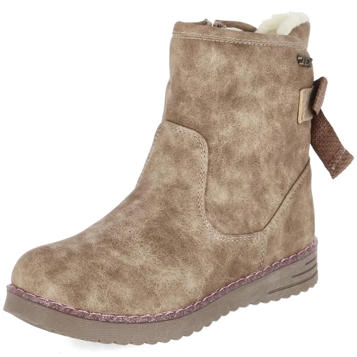 Der Winterboot von Indigo vereint kindgerechten Komfort mit funktionalen Details für kalte Tage. Das braune Obermaterial aus Textil und Synthetik ist wasserfest und zugleich atmungsaktiv, während ein warmes Teddyfutter für wohlige Wärme sorgt. Eine textile Decksohle schmiegt sich angenehm an, die runde Schuhspitze bietet Zehenfreiheit. Dank Reißverschluss gelingt das An- und Ausziehen im Schulalltag mühelos. Ein verstärkter Fersenbereich und ein flexibles Fersenpolster unterstützen wachsende Füße, die flexible, griffige Laufsohle gibt Halt auf nassem Asphalt und winterlichen Wegen. Liebevolle Akzente setzen der rosa glitzernde Sohlenrahmen und die textile Schleife am hinteren Schaft. Das Modell fällt normal aus und passt zuverlässig zu den Größen von Grundschulkindern. Modetipp: Mit Thermojeans, einem Wollparka und einer Mütze in Rosé wird der Glitzerrahmen elegant aufgegriffen, ohne den robusten Charakter zu verlieren.