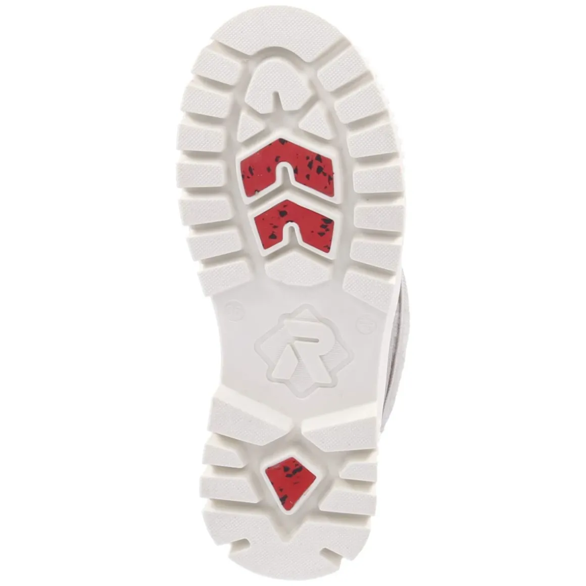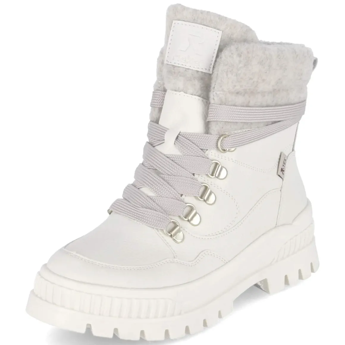 Modell Winterboots von Rieker verbindet funktionale Stärke mit sportlicher Optik. Das weiße Obermaterial aus Leder und Textil wirkt modern und ist wasserabweisend, zugleich in wasserfester Verarbeitung angelegt. Warmfutter und Thermosohle halten zuverlässig warm, während die atmungsaktive Ausstattung für ein ausgeglichenes Fußklima sorgt. Runde Schuhspitze, gepolsterter Einstieg und gepolstertes, herausnehmbares Wechselfußbett mit Textil-Decksohle bieten hohen Komfort. Der Mix aus Schnürsenkeln und seitlichem Reißverschluss samt Anziehlasche erleichtert den Einstieg. Eine rutschfeste Profilsohle sowie verstärkter Fersen- und Zehenbereich geben sicheren Halt im Winteralltag. Fällt größengetreu aus und richtet sich an erwachsene Damen. Modetipp: Für einen frischen Winterlook mit Steppmantel in Creme, gerippter Strickmütze und schmaler Wollhose kombinieren – die weißen Boots setzen helle Akzente.