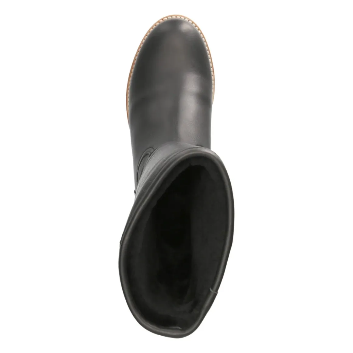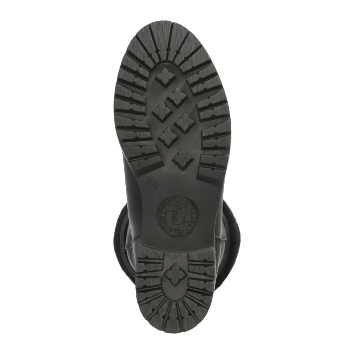 Der Winterstiefel PATRICIA IGLOO B von Panama Jack verbindet robuste Funktion mit eleganter Schlichtheit. Das schwarze Glattleder mit wasserabweisendem Finish schützt zuverlässig, während warmes Lammfellfutter und Lederdecksohle für ein behagliches Klima sorgen. Der etwa 28 cm hohe Schaft mit rund 32 cm Umfang umschließt komfortabel, die runde Spitze und der verstärkte Fußrahmen geben zusätzlichen Halt. Ein 5 cm hoher Blockabsatz bringt standfeste Höhe, die flexible, rutschhemmende Profilsohle bietet Grip auf winterlichen Wegen. Ohne Verschluss gefertigt, zeigt der Boot eine klare, schlanke Silhouette und lässt sich vielseitig kombinieren – von Denim bis Wollkleid. Modetipp: Zu einem langen, geraden Wollmantel und grob gestrickten Socken, die dezent über den Schaft blitzen, entsteht ein lässig-edler Kälte-Look.