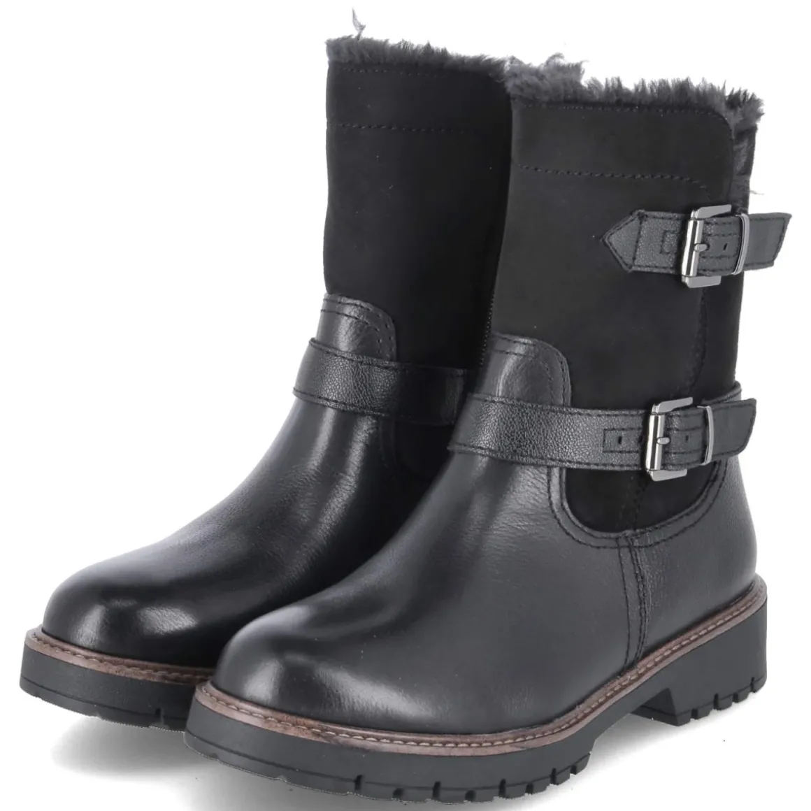 Die Tamaris Winterstiefeletten setzen auf einen modernen Material-Mix aus Synthetik, Leder und Textil und kommen in zeitlosem Schwarz. Das warme Futter umschließt den Fuß angenehm, unterstützt von einer weichen, textilen Decksohle. Ein komfortabler Reißverschluss ermöglicht den schnellen Einstieg, während zwei verstellbare Riemen am samtig-weichen Schaft für individuellen Halt sorgen. Die verstärkte Ferse und die flexible, rutschfeste Profilsohle geben Sicherheit auf glatten Wegen. Mit rund gearbeiteter Spitze, normaler Passform und 4 cm hohem Blockabsatz bleibt der Look feminin und zugleich alltagstauglich. Der Schaft misst ca. 17 cm in der Höhe bei ca. 30 cm Umfang. Modetipp: Besonders stimmig wirkt das Modell zu einer gestrickten Midi-Rippe, dicker Strumpfhose und Wollmantel; für lässige Tage punkten gekrempelte Straight-Jeans und ein voluminöser Steppparka.
