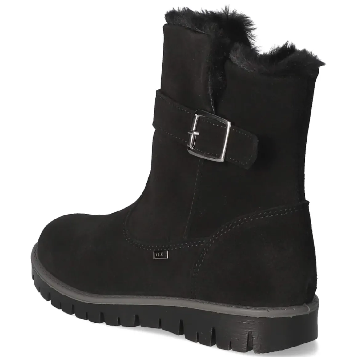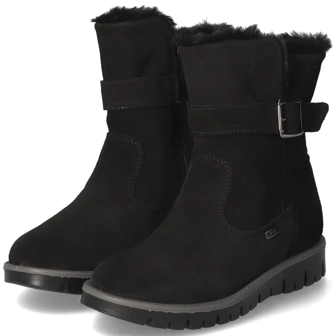 Die Imac Winterstiefeletten in Schwarz vereinen kindgerechten Komfort mit robuster Wintertauglichkeit. Weiches Rauleder aus atmungsaktivem Echtleder, warmes Futter und ein Schaftrand in Kunstfelloptik sorgen für behagliche Wärme an kalten Tagen. Dank wasserabweisender Tex-Ausstattung bleiben Füße bei Schneematsch geschützt, während die flexible, rutschfeste Laufsohle sicheren Halt bietet. Der bequeme Reißverschlusseinstieg erleichtert das An- und Ausziehen, die runde Spitze schafft Zehenfreiheit, und die verstärkte Ferse erhöht die Stabilität. Ein Wechselfußbett und eine textile Decksohle unterstützen ein angenehmes Fußklima; die Passform fällt normal aus. Der Zierriemen mit metallischer Schnalle setzt einen dezenten Akzent, der vielseitig kombinierbar ist. Modetipp: Perfekt zu Thermojeans, Steppjacke und Strickmütze in gedeckten Tönen für einen stilvollen, funktionalen Winterlook im Alltag und auf dem Spielplatz.