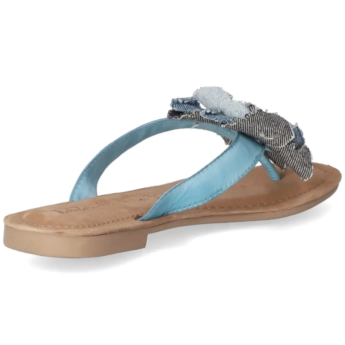 Der Damen-Zehentrenner von LAZAMANI zeigt, wie lässige Sommerlaune und elegante Optik perfekt harmonieren. Weiches Glattleder in sattem Blau umschließt den Fuß, die offene Schuhspitze bringt Leichtigkeit, während die große, mehrfarbige Blüte auf dem Zehenbereich den Look kunstvoll akzentuiert. Langlebiges Echtleder und eine Lederdecksohle treffen auf ein gepolstertes Lederfußbett, das auch an langen Tagen angenehmen Komfort bietet. Die flexible, griffige Laufsohle sorgt für Stabilität auf verschiedenen Untergründen. Ohne Verschluss lässt sich das Modell schnell hinein- und herausschlüpfen, der Schnitt fällt normal aus. Ein vielseitiger Begleiter zu luftigen Sommergarderoben, der feminine Details mit Alltagstauglichkeit vereint. Modetipp: Zu einem weißen Midikleid und zarten Gold-Accessoires tragen, dazu eine geflochtene Korbtasche – so kommt die blaue Farbnuance und die Blütenapplikation besonders stilvoll zur Geltung.