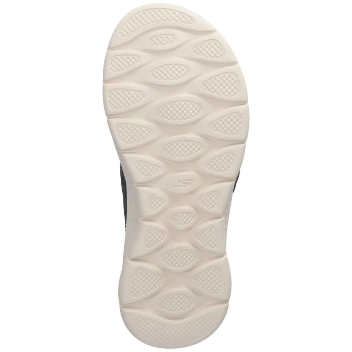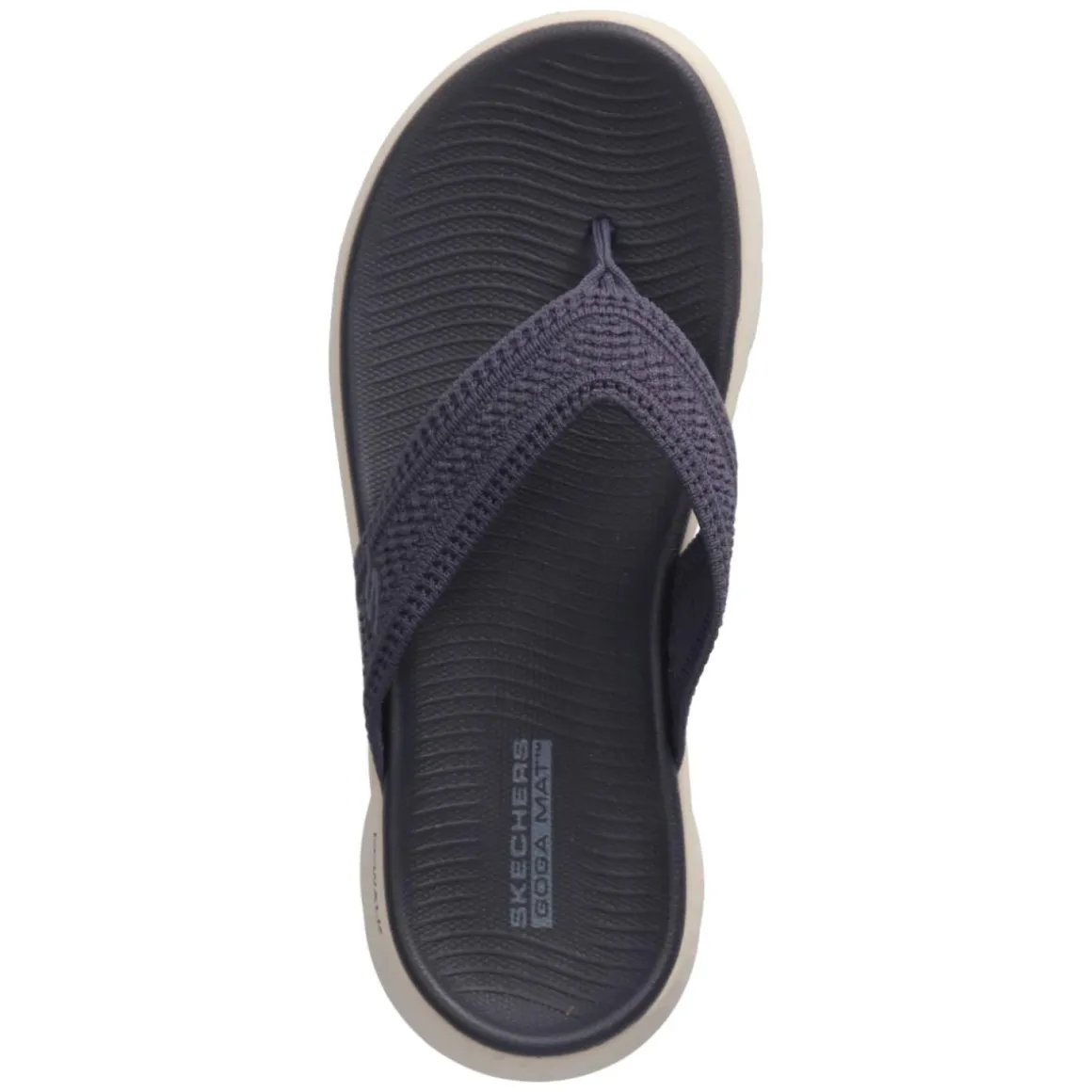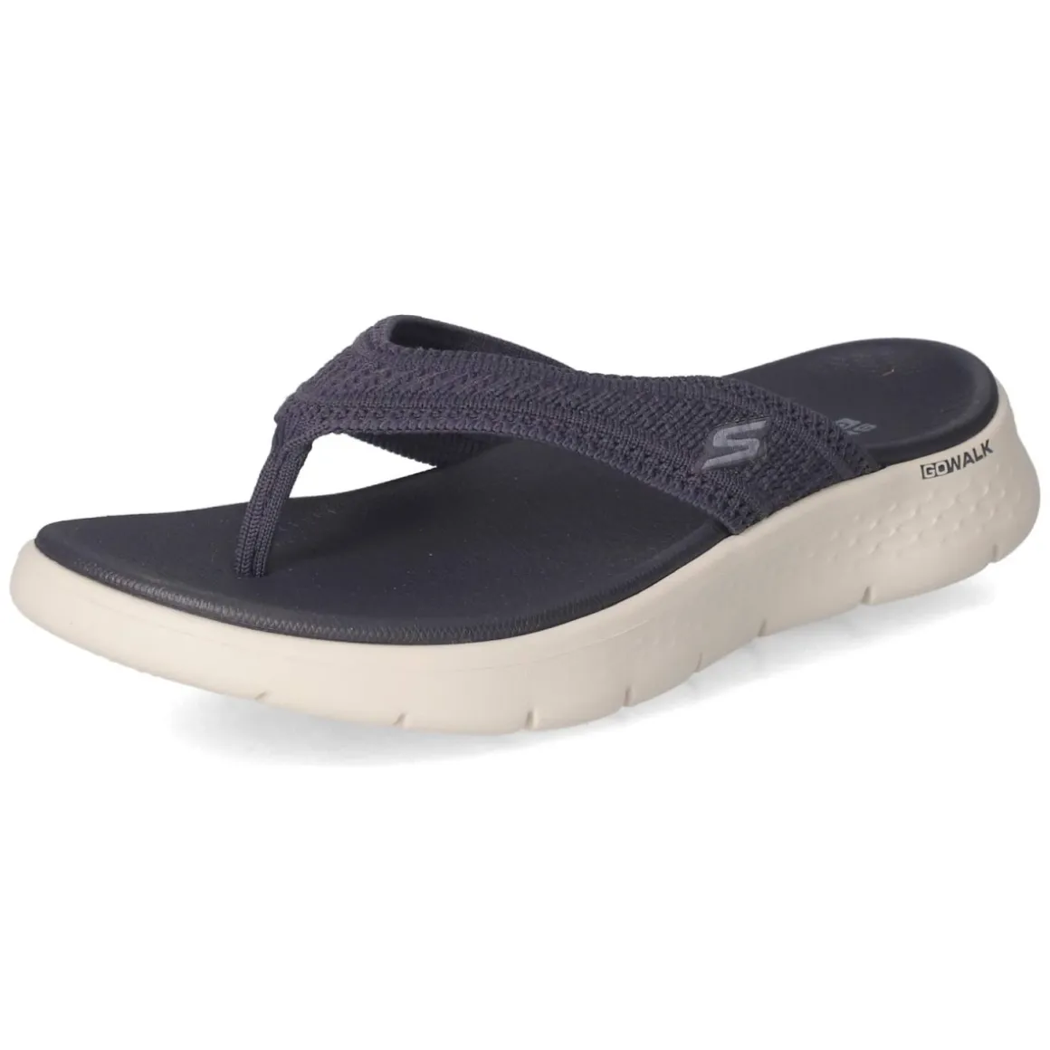Der Zehentrenner HOLLY von Skechers vereint sommerliche Leichtigkeit mit verlässlichem Komfort. Das dunkelblaue Obermaterial aus Textil präsentiert sich mit Riemen in Strickoptik und umschmeichelt den Fuß mit unkompliziertem Einstieg und offener Spitze. Das weich gepolsterte Fußbett und die flexible, rutschfeste Laufsohle sorgen für angenehmes Auftreten auf Stadtpflaster, Promenade oder am Pool. Praktisch im Alltag: Das Modell ist maschinenwaschbar und trocknet schnell, wodurch Frische und Pflegeleichtigkeit gewährleistet sind. Dank normaler Passform fällt die Größenwahl einfach aus; die synthetische Decksohle ergänzt die langlebige Konstruktion. Modetipp: In Kombination mit hellen Leinen-Shorts, einem gestreiften Shirt und einer Basttasche entsteht ein lässiger Maritim-Look, der das Dunkelblau elegant aufgreift und vom Strand bis in die City überzeugt.