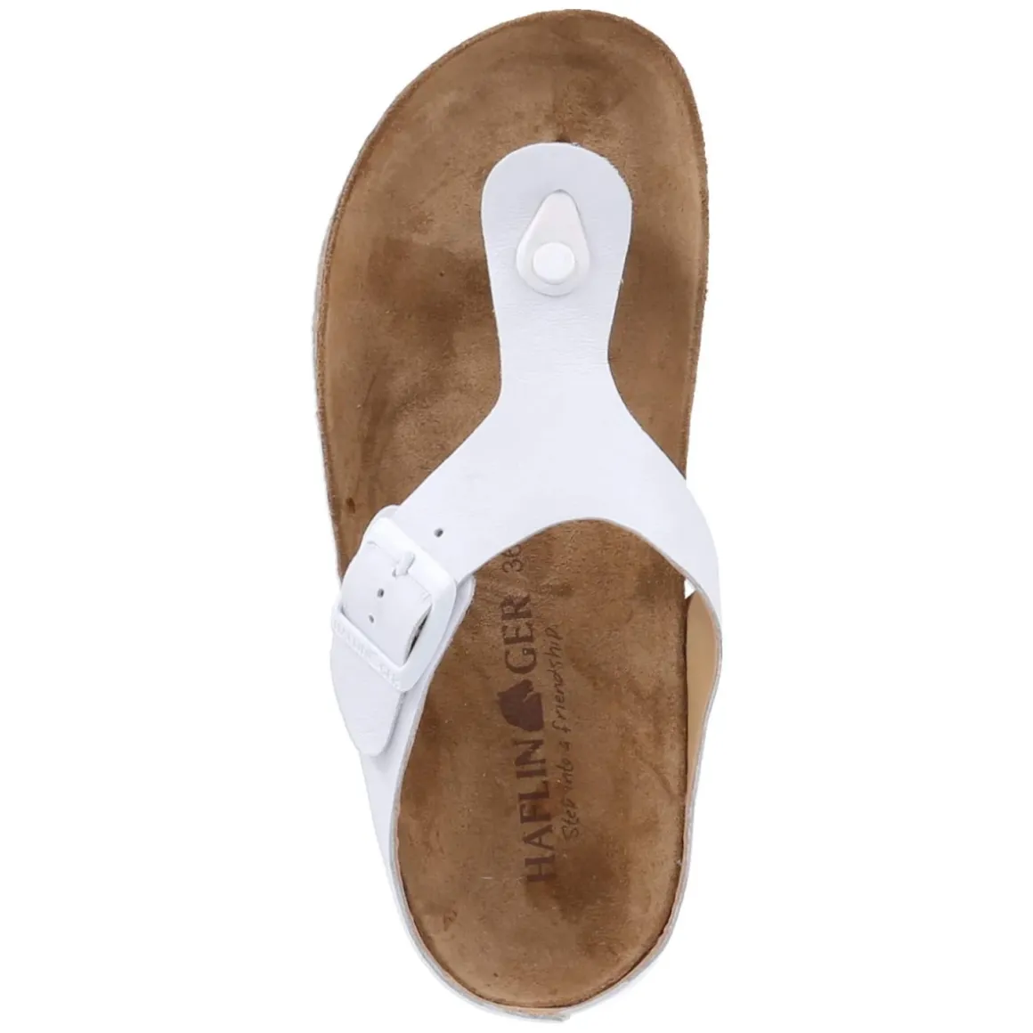 Der Zehentrenner MEMPHIS von Haflinger vereint pures Understatement mit spürbarer Qualität. Weißes Glattleder prägt den klassischen Look, während der verstellbare Riemen mit metallischer Schnalle sicheren Halt ermöglicht. Die lederne Decksohle und das vorgeformte, gepolsterte Tieffußbett bieten angenehme Dämpfung und unterstützen den natürlichen Stand, ideal für längere Tage auf den Beinen. Die flexible, griffige Laufsohle sorgt für Stabilität auf unterschiedlichen Untergründen, die offene Schuhspitze bringt sommerliche Leichtigkeit ins Outfit. Das Modell fällt normal aus und überzeugt durch langlebiges Echtleder, das mit der Zeit eine individuelle Patina entwickeln kann. Modetipp: Zu einer hellen Leinenhose und einem luftigen Hemd kombinieren, dazu feiner Schmuck und eine schlichte Umhängetasche für einen modernen, entspannten City-Look.