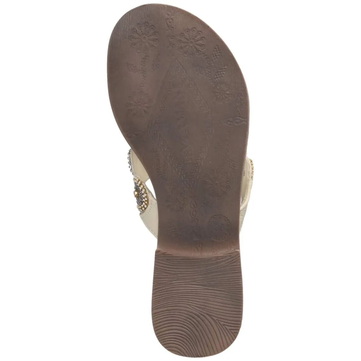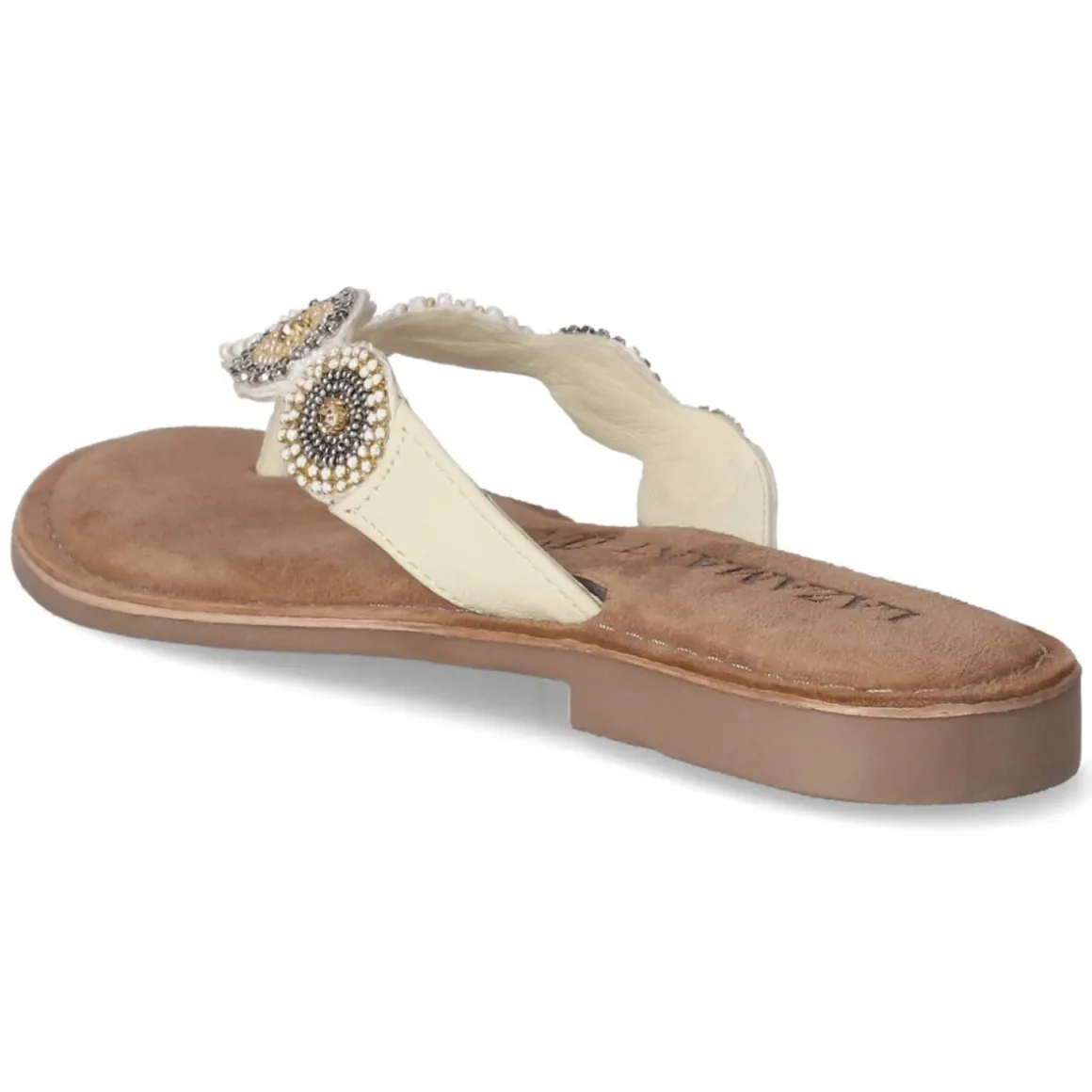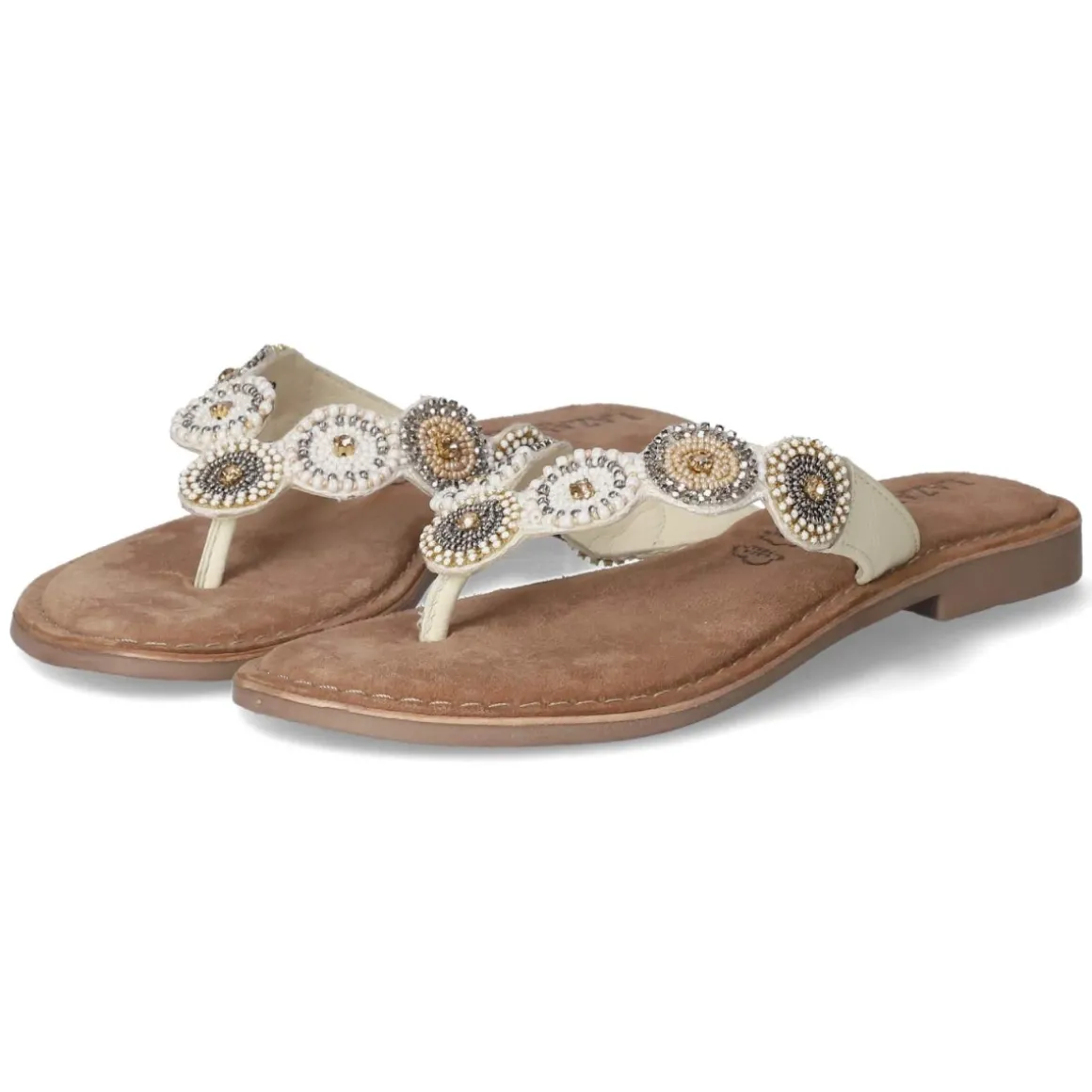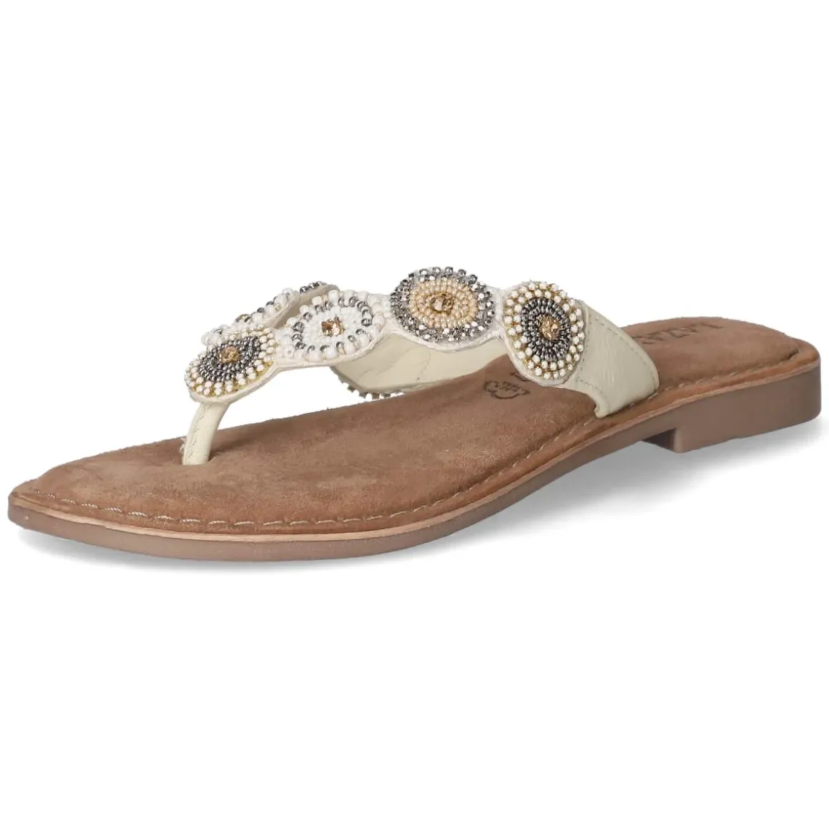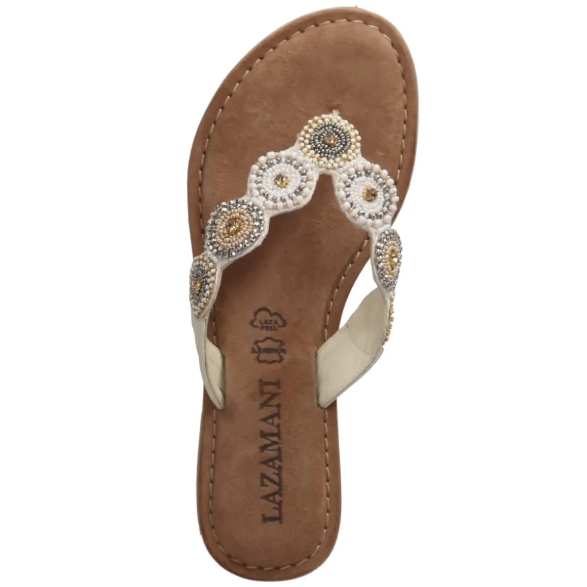 Sommerliche Eleganz trifft auf Komfort: Der LAZAMANI Zehentrenner in strahlendem Weiß verbindet feines Glattleder mit atmungsaktivem Echtleder für ein angenehm luftiges Tragegefühl. Die offene Schuhspitze und der unkomplizierte Einstieg ohne Verschluss machen das Anziehen mühelos, während die flexible, griffige Laufsohle sicheren Halt bietet – ob auf Kopfsteinpflaster oder Promenade. Ein gepolstertes Fußbett und eine hochwertige Ledersohle umspielen den Fuß weich, die Passform fällt normal aus. Eyecatcher sind sieben kreisförmige Ornamente mit funkelnden Schmucksteinen, die dem schlichten Design eine glamouröse Note verleihen. Modetipp: Zu einer naturfarbenen Leinenhose und einer lockeren Hemdbluse entsteht ein moderner Riviera-Look; eine strukturierte Basttasche und dezenter Goldschmuck greifen die strahlenden Akzente der Ornamentsteine harmonisch auf.