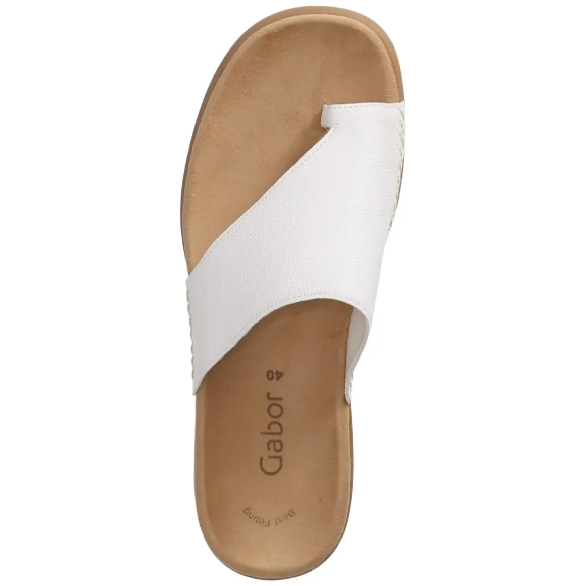 Gabor präsentiert einen puristischen Zehentrenner in zeitlosem Weiß, der mit reduziertem Design und durchdachter Funktion überzeugt. Das Obermaterial aus langlebigem Echtleder in glatter Ausführung fühlt sich angenehm an und gewinnt mit jedem Tragen an Charakter. Eine vorgeformte Decksohle aus Textil und das dämpfende Fußbett sorgen für entspannten Komfort, während die flexible Laufsohle mit Grip sicheren Halt bietet. Die offene Schuhspitze unterstreicht den luftigen Look, die verschlusslose Konstruktion ermöglicht unkompliziertes Hineinschlüpfen. Ein seitlich gesetzter, zierender Kreuzstich verleiht feine Handwerks-Note. Dank normaler Passform fällt das Modell größengetreu aus und bietet vielseitige Kombinationsmöglichkeiten von Freizeit bis City. Modetipp: Besonders stimmig zu Leinenhosen, einem schlichten Hemdkleid oder Denim-Shorts; eine Korbtasche und filigraner Schmuck runden den Look sommerlich ab.