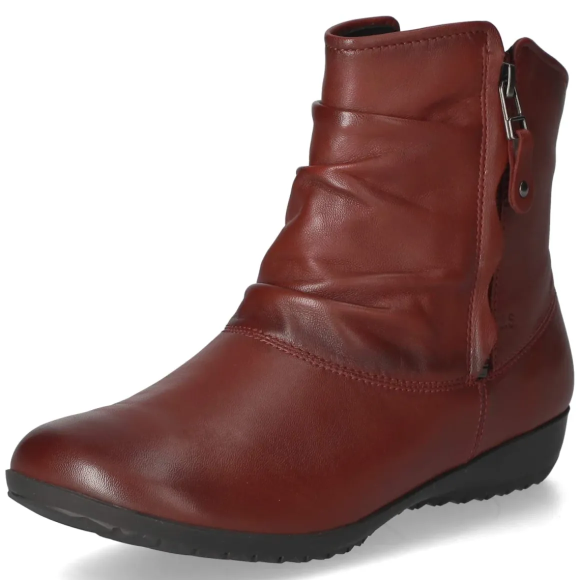 Der Ankle Boot Naly 24 von Josef Seibel setzt in sattem Rot ein klares Statement und verbindet Komfort mit Alltagstauglichkeit. Atmungsaktives Echtleder in glatter Ausführung umschließt den Fuß angenehm, die runde Spitze bietet Zehenfreiheit. Ein leichtes Fleecefutter sorgt an kühlen Tagen für wohlige Wärme, ohne aufzutragen. Dank zwei praktischer Reißverschlüsse gelingt der Einstieg mühelos, feine Raffungen und dezente Markendetails unterstreichen die feminine Linie. Die verstärkte Ferse stabilisiert, während die flexible, rutschhemmende Laufsohle zuverlässigen Grip auf nassem Pflaster liefert. Eine textile Decksohle und das herausnehmbare Wechselfußbett erhöhen den Tragekomfort und lassen Platz für eigene Einlagen. Die Passform fällt regulär aus. Modetipp: Das leuchtende Rot wirkt besonders modern zu grauen Wollmänteln und dunkelblauen Denim-Looks.