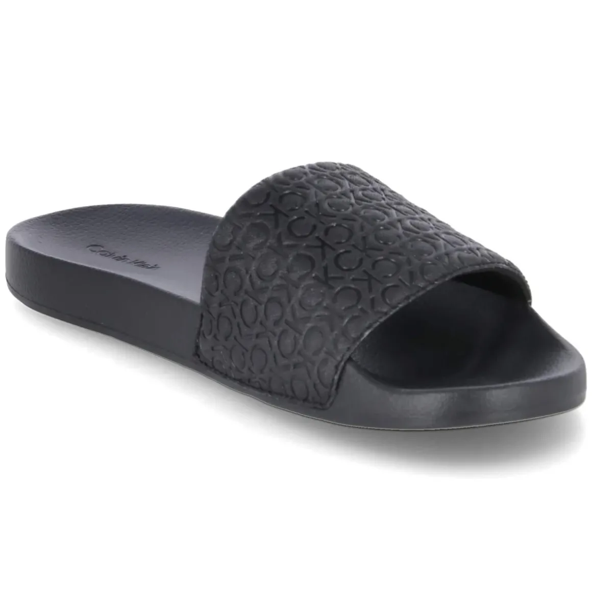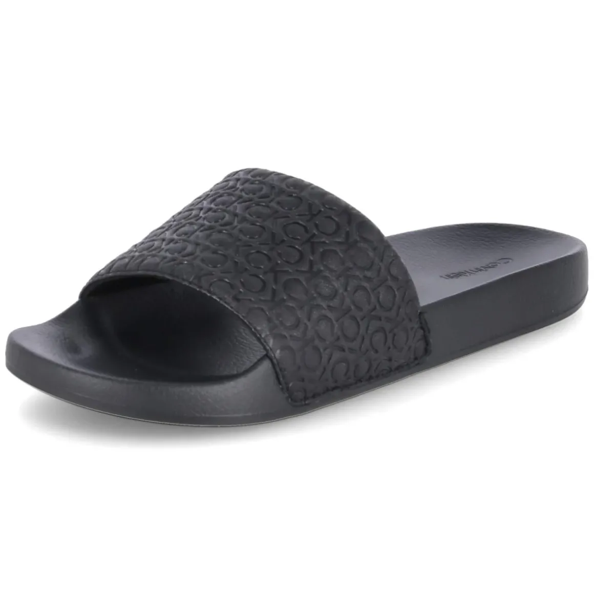 Die Calvin Klein POOL SLIDE MONO zeigt minimalistischen Style mit markanter Signatur. Der gepolsterte Riemen aus pflegeleichter Synthetik trägt tonale CK-Prägungen, die dem schwarzen Design eine dezent gemusterte Optik geben. Dank offener Schuhspitze und Verschlussfreiheit gelingt das Hineinschlüpfen bequem, die vorgeformte Decksohle stützt den Fuß an langen Tagen am Pool oder in der City. Eine flexible Laufsohle mit leichtem Profil sorgt für trittsicheren Komfort auf glatten Untergründen. Synthetik als Ober- und Deckmaterial ist unempfindlich gegenüber Feuchtigkeit und lässt sich mühelos reinigen. Der moderne, schlanke Leisten fällt schmaler aus; bei kräftigerem Fußspann empfiehlt sich die Wahl der größeren Größe. Modetipp: Zu schwarzen Swimshorts und weißem Leinenhemd entsteht ein cleaner Resort-Look, urban funktioniert die Slide mit schmaler Chino-Shorts und Oversize-Tee im Ton-in-Ton-Styling.