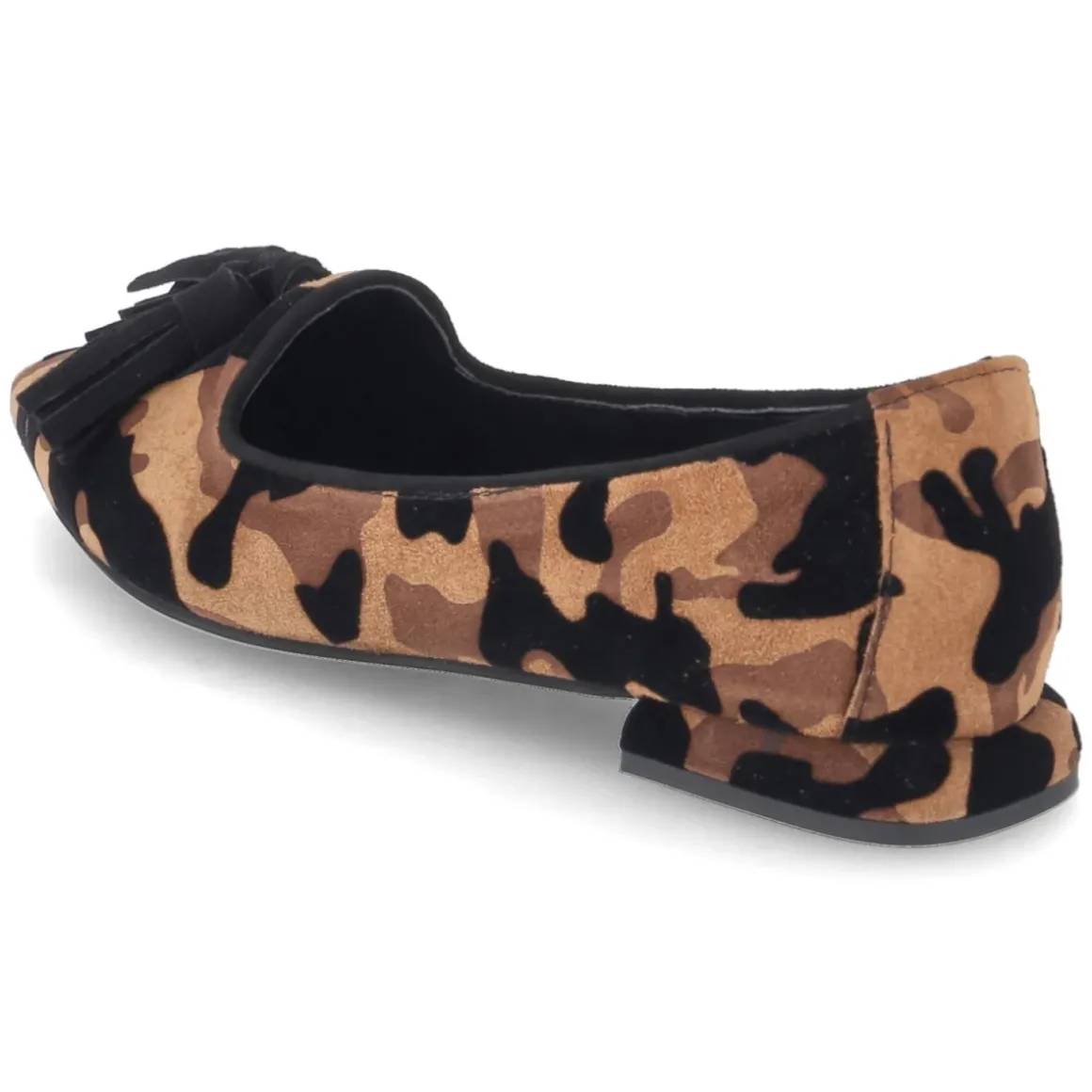 Diese Damen-Ballerinas von Kaerlek interpretieren den Klassiker mit urbaner Lässigkeit: Braunes Camouflage auf softem Rauleder trifft auf eine spitze Silhouette, die den Fuß optisch streckt. Quasten über dem Zehenbereich setzen einen verspielten Akzent, während der flache Blockabsatz Stabilität verleiht. Die Lederdecksohle und ein leicht gepolsterter Fersenbereich sorgen für angenehmen Komfort, unterstützt vom relaxten Leichtgewicht-Charakter und der flexiblen, griffigen Laufsohle. Die Schlupfform ohne Verschluss macht das Anziehen unkompliziert, die Passform fällt normal aus und begleitet souverän Büro- wie Wochenend-Looks. Modetipp: Besonders stimmig zu monochromen Sand- und Beigetönen mit feinen Goldaccessoires; starke Kontraste entstehen mit schwarzer Zigarettenhose und strukturiertem Blazer.