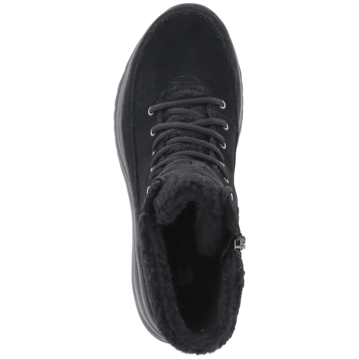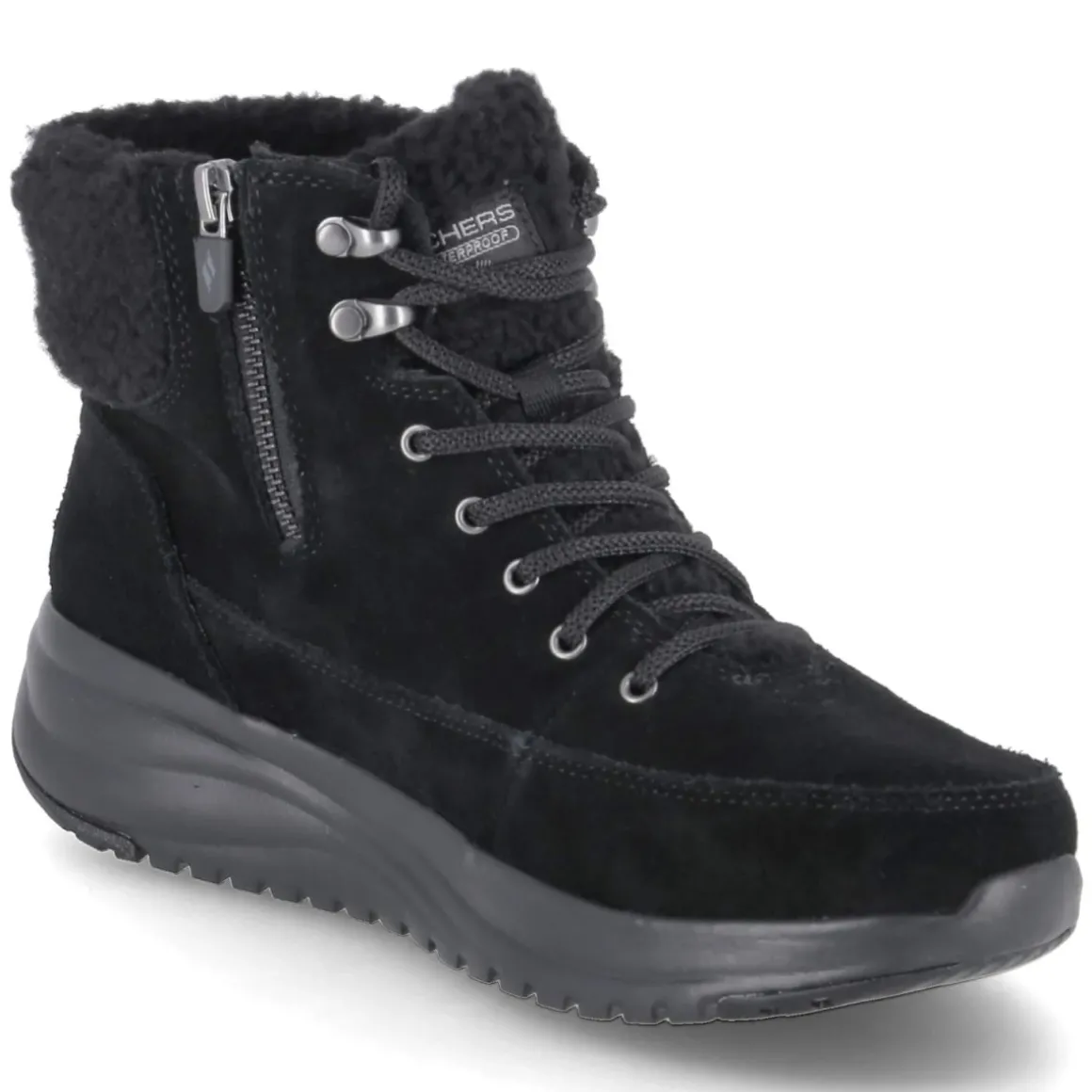 Skechers ON THE GO STELLAR vereint wintertaugliche Funktion mit sportlichem Look. Das schwarze Rauleder zeigt sich robust und zugleich angenehm weich, die wasserfest verarbeitete und atmungsaktive Konstruktion hält zuverlässig trocken. Warmfutter mit kuscheligem Teddykragen umschließt den Knöchel, während das weiche Fleecefutter bis in die Spitze wärmt. Schnürung sorgt für präzisen Halt, der zusätzliche Reißverschluss ermöglicht einen schnellen Einstieg. Ein verstärkter Fußrahmen stabilisiert, das gepolsterte Memory Foam Fußbett federt jeden Schritt ab. Die rutschhemmende Profilsohle greift sicher auf nassem Asphalt und winterlichen Wegen. Runde Schuhspitze und normal ausfallende Passform bieten angenehme Zehenfreiheit; die Decksohle aus Textil punktet mit Komfort im Alltag. Modetipp: Mit Pufferjacke, Thermo-Leggings und grob gestrickter Beanie entsteht ein urbaner Winter-Look.