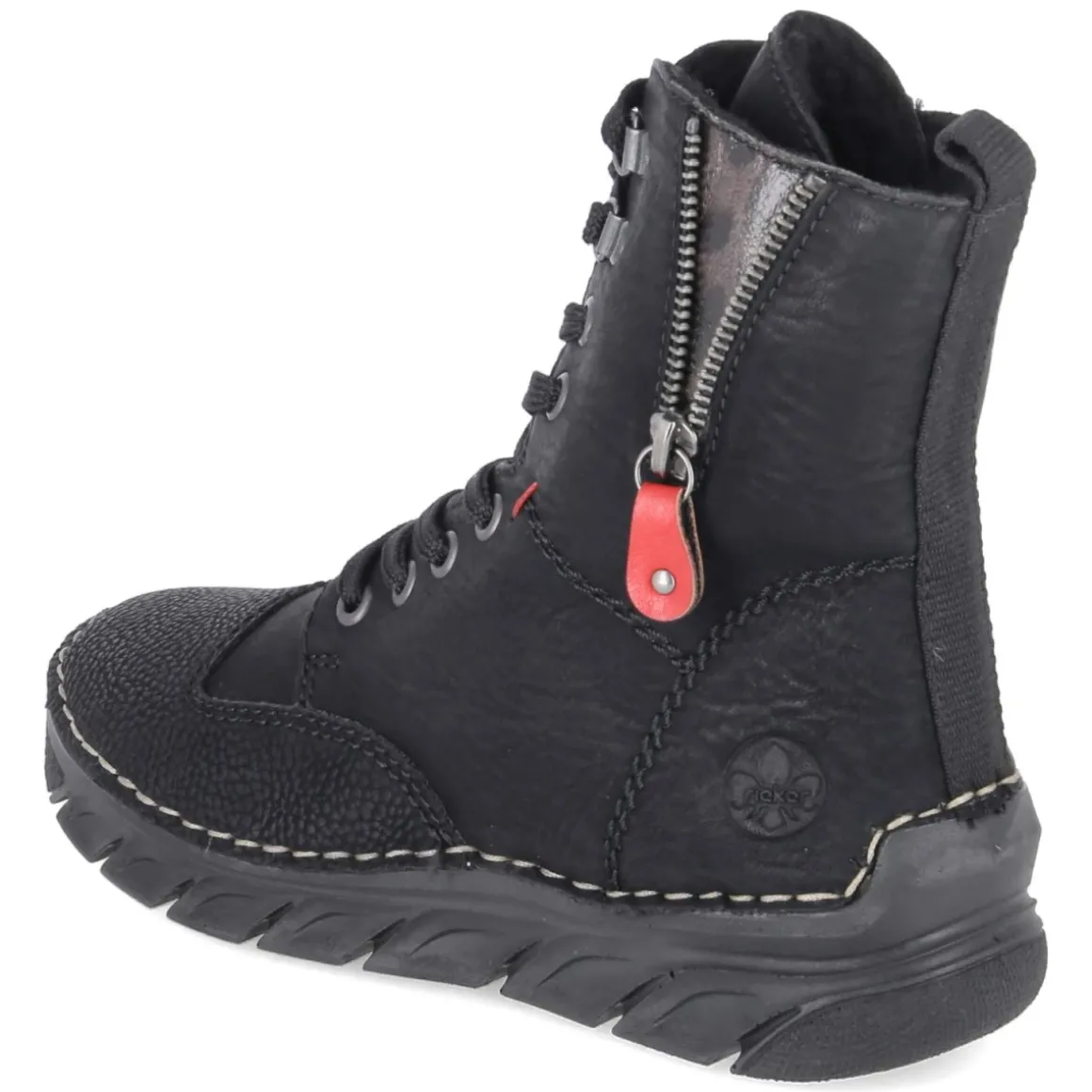 Der schwarze Damen-Boot von Rieker vereint wintertaugliche Wärme mit entspanntem Tragegefühl. Das pflegeleichte Synthetik-Obermaterial zeigt eine klare Linienführung, ergänzt durch einen Zierreißverschluss am Schaft, während die runde Spitze und der verstärkte Fersen- und Zehenbereich Alltagstauglichkeit unterstreichen. Warmfutter mit weichem Teddyfutter umschließt den Fuß, die Textil-Decksohle und das gepolsterte Fußbett sorgen für anhaltenden Komfort. Dank relaxtem Leichtgewicht und flexibler, rutschfester Laufsohle bleibt jeder Schritt angenehm und sicher. Der praktische Mix aus Schnürsenkeln und seitlichem Reißverschluss erleichtert den Einstieg, eine Anziehlasche unterstützt zusätzlich. Die Passform fällt normal aus, wodurch unkomplizierte Größenauswahl gelingt. Modetipp: Eine Kombination mit schwarzer Strumpfhose, Midirock in Wolloptik und Oversize-Strick schafft einen lässig-warmen City-Look.