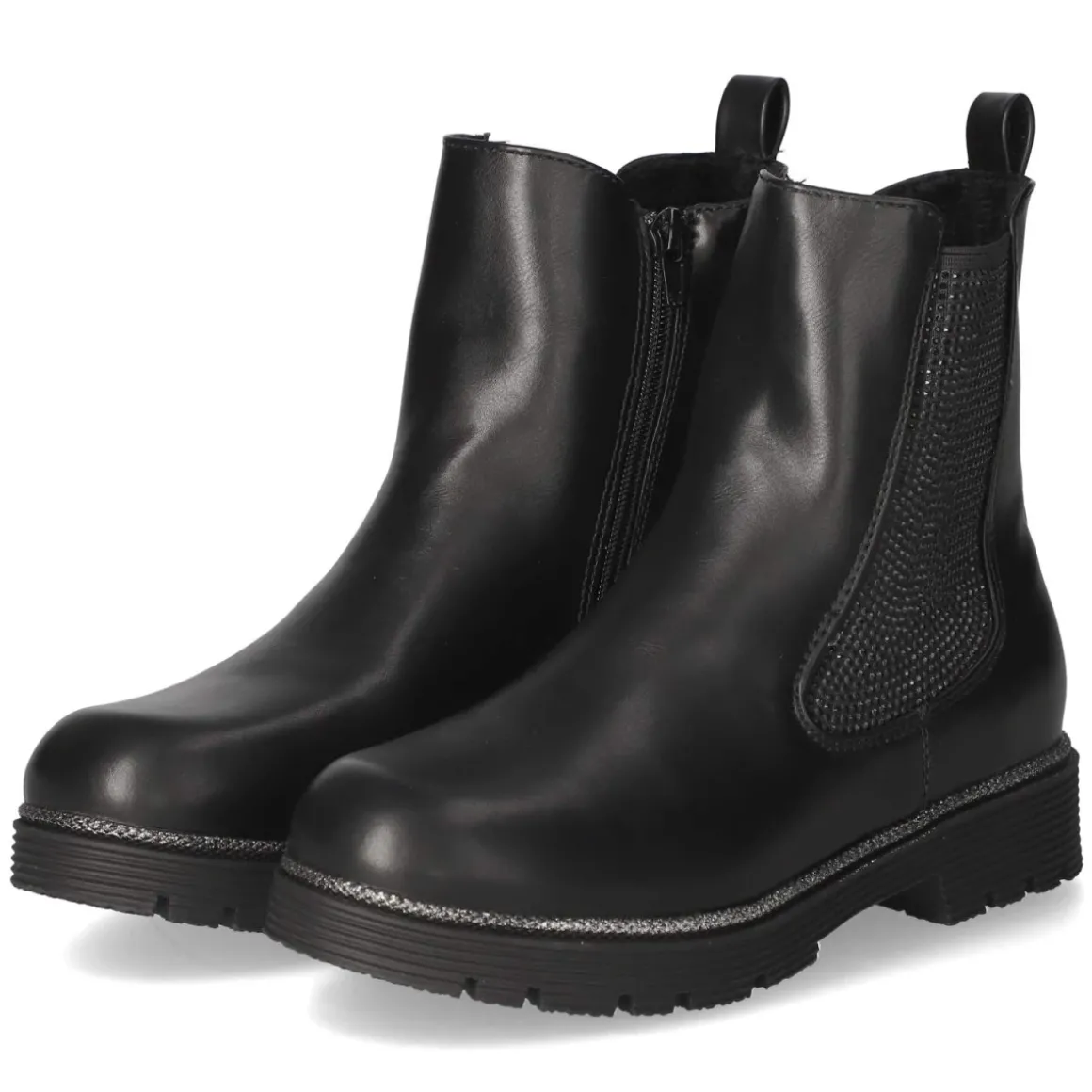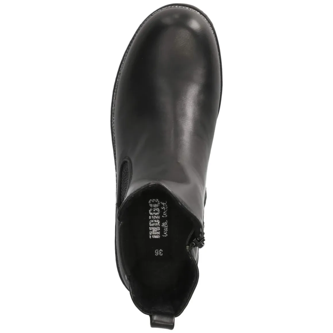 Die Chelsea Boots von Indigo vereinen kindgerechten Komfort mit zeitlosem Look. Das schwarze Obermaterial aus Textil und Synthetik wirkt edel und ist zugleich pflegeleicht, während die runde Spitze und der 3 cm hohe Blockabsatz für eine standfeste Silhouette sorgen. Ohne Verschluss konzipiert, erleichtern Elastikeinsätze am Schaft und die praktische Anziehlasche das schnelle Hineinschlüpfen. Ein leichtes Futter wärmt an kühlen Tagen, das gepolsterte Fußbett und die flexible, rutschfeste Laufsohle bieten angenehme Dämpfung und sicheren Halt. Die verstärkte Ferse erhöht die Stabilität, die Decksohle aus Synthetik punktet mit unkomplizierter Pflege. Der Schuhrahmen mit silbernem Schimmer setzt einen feinen Akzent, der zu vielen Outfits passt. Der Schnitt fällt normal aus und eignet sich für den Alltag ebenso wie für festliche Anlässe. Modetipp: Zu Strickkleid und blickdichter Strumpfhose oder zu Slim-Jeans und Wollmantel entsteht ein stilvoller, moderner Look.
