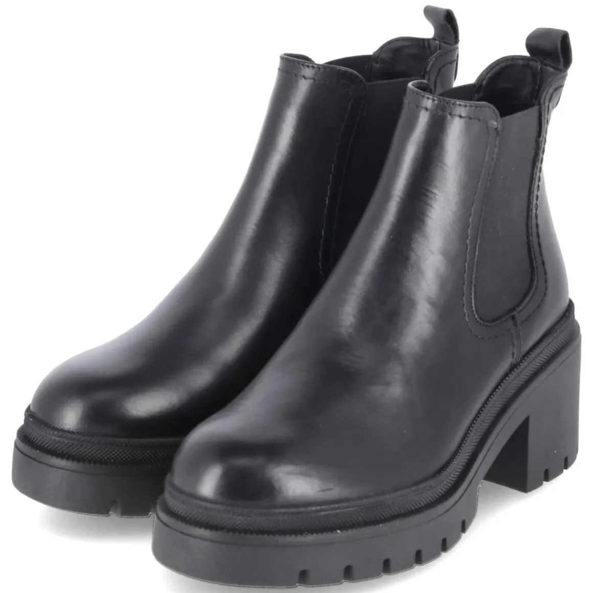 Der Chelsea Boot von Tamaris setzt auf eine moderne, klare Linie und vereint Komfort mit stilvoller Präsenz. Schwarzes Glattleder aus langlebigem Echtleder formt eine edle Optik, die runde Schuhspitze und die zwei großen, seitlichen Elastikeinsätze sorgen für den typischen Chelsea-Charakter. Dank Anziehlasche gelingt der Einstieg mühelos, der Verzicht auf einen Verschluss hält das Design pur. Ein gepolstertes Fußbett sowie die Decksohle aus Textil und Synthetik bieten ein angenehmes Tragegefühl im Alltag, während die rutschfeste Profilsohle sicheren Halt verleiht. Der 7,5 cm hohe Blockabsatz streckt die Silhouette, bleibt aber stabil und alltagstauglich. Das Modell fällt normal aus und richtet sich an erwachsene Damen, die eine moderne Optik mit Funktionalität verbinden möchten. Modetipp: Zu knöchellanger Straight-Jeans und Oversize-Blazer entsteht ein urbaner Look, der sowohl im Büro als auch am Abend überzeugt.