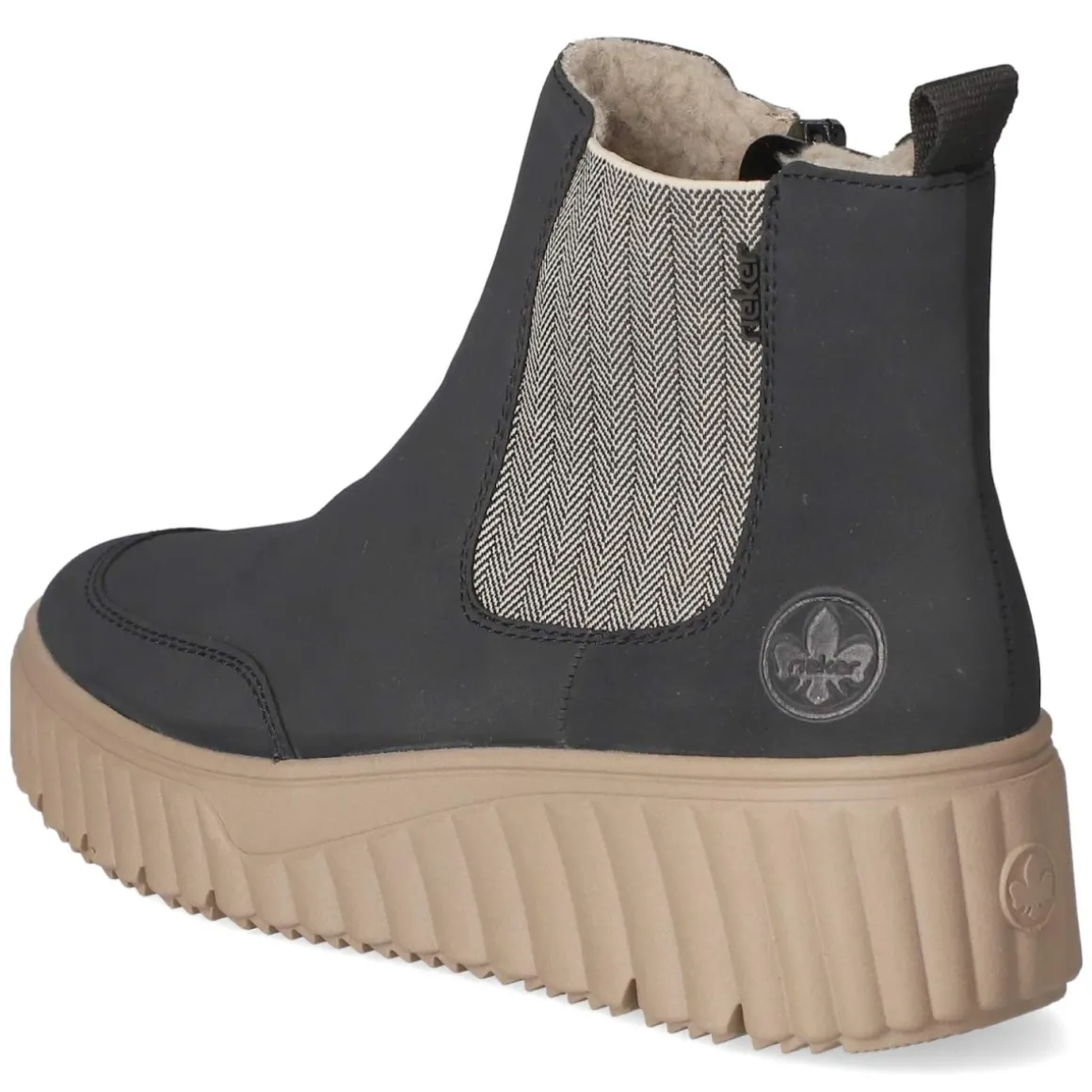 Der blaue Chelsea Boot von Rieker interpretiert den Klassiker in wintertauglicher Ausführung. Das pflegeleichte Synthetik-Obermaterial zeigt eine satte Blaunuance, die sich vielseitig kombinieren lässt. Innen sorgt Warmfutter mit angenehm weichem Textilfutter und einer Decksohle aus Textil für wohlige Wärme. Die runde Schuhspitze unterstreicht den zeitlosen Look, während Reißverschluss und Elastikeinsatz am Schaft komfortables An- und Ausziehen begünstigen. Ein Wechselfußbett erlaubt die individuelle Anpassung, besonders praktisch für eigene Einlagen. Der Leisten fällt schmaler aus und verleiht eine elegante Silhouette. Modetipp: Mit verkürzter Mom-Jeans, grobem Strickpullover und einem kamelfarbenen Wollmantel entsteht ein moderner City-Look, bei dem melierte Wollsocken dezent aus dem Schaft blitzen dürfen.