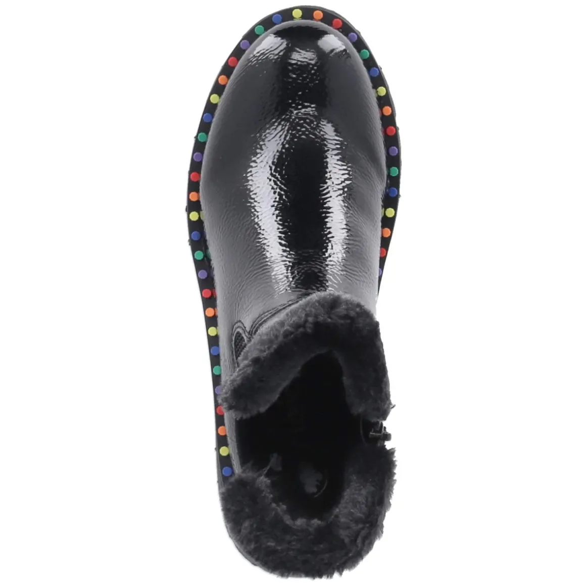 Diese Chelsea Boots von Rieker verbinden elegante Lackoptik mit wintertauglichem Komfort. Das schwarze Obermaterial aus Synthetik glänzt stilvoll und wird von einer Schaftkrempe mit Kunstfellbesatz akzentuiert, während der bunt gepunktete Sohlenrahmen eine moderne Note setzt. Das Warmfutter umschließt den Fuß angenehm, die weiche Decksohle aus Textil und das austauschbare Wechselfußbett sorgen für individualisierbaren Komfort. Dank rutschhemmender Laufsohle und stabilem 5-cm-Blockabsatz gelingt der Auftritt souverän, der Reißverschluss ermöglicht schnelles An- und Ausziehen. Der Schnitt fällt schmaler aus und betont die schlanke Silhouette, die runde Spitze hält den Look klassisch. Ein relaxtes Leichtgewicht für lange Tage in Stadt und Büro. Modetipp: Mit Wollmantel, Feinstrickkleid und blickdichter Strumpfhose entsteht ein urbaner Chic, der die glänzende Oberfläche effektvoll in Szene setzt.