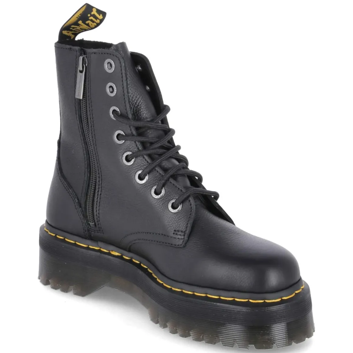 Der Combat Boot JADON III von Dr. Martens liefert markante Höhe und Standfestigkeit. Schwarzes Glattleder in robuster Qualität trifft auf eine vernähte Plateau-Profillaufsohle mit 5 cm Absatz, deren rutschhemmendes Profil zuverlässigen Grip bietet. Die runde Schuhspitze und der verstärkte Fersenbereich sorgen für Komfort und Formstabilität, während Schnürung und zusätzlicher Reißverschluss das An- und Ausziehen erleichtern. Innen verwöhnen Textilfutter und eine Lederdecksohle mit weichem Fersenpolster. Eine Anziehlasche setzt den ikonischen Akzent. Der Leisten fällt normal aus und bietet die typische Dr. Martens Passform. Modetipp: Besonders wirkungsvoll zu monochromen Looks mit Lederjacke und verkürzter Straight-Leg-Jeans oder als Kontrast zum fließenden Midikleid.