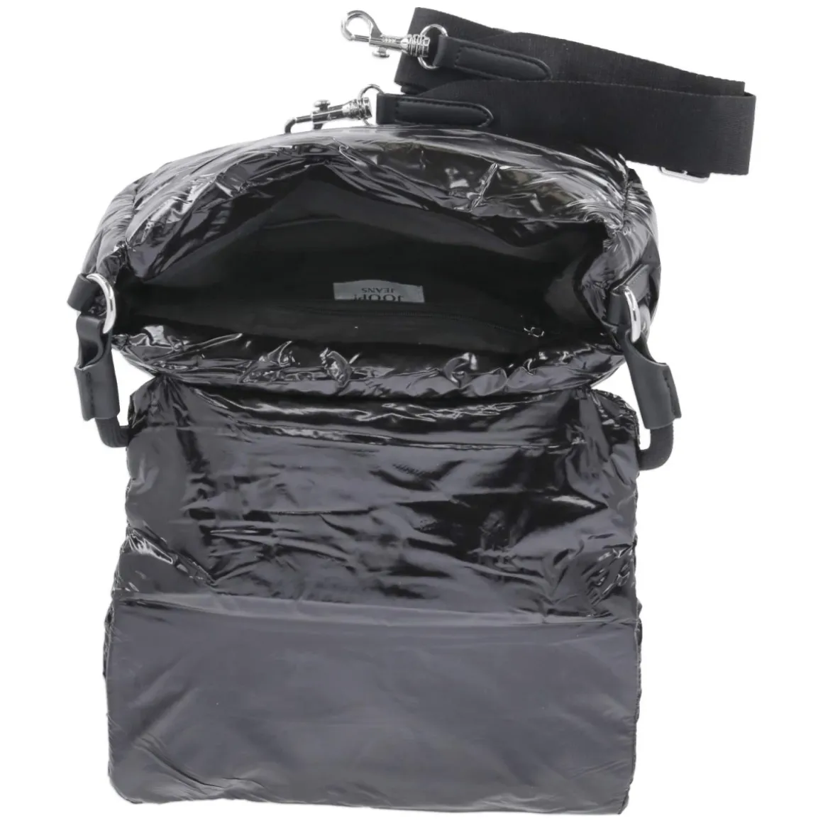 Die Flap Bag VARSITY ZORA in Schwarz setzt mit puff-gestepptem Lackdesign und markantem Frontlogo ein klares Statement. Die kompakte Silhouette (ca. 15 x 25 x 10 cm) fasst rund 3 Liter und bietet mit einem Reißverschlussfach sowie einem Steckfach strukturierte Übersicht für Essentials. Der magnetische Überschlag schließt sicher und lässt zugleich schnellen Zugriff zu. Flexible Tragemöglichkeiten ergeben sich aus dem festen Schulterriemen von ca. 40 cm und dem zusätzlich verstellbaren Gurt bis ca. 130 cm, so wird aus der eleganten Schultertasche im Handumdrehen eine komfortable Crossbody-Begleitung. Glänzende Oberfläche, weiches Volumen und klare Linien verbinden Mode und Funktion in einem vielseitigen Accessoire für Damen. Modetipp: Im monochromen Look mit schwarzem Blazer, Wide-Leg-Hose und metallischen Akzenten wirkt die Tasche besonders modern.