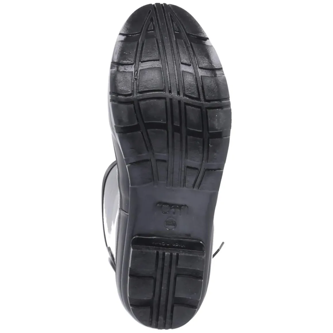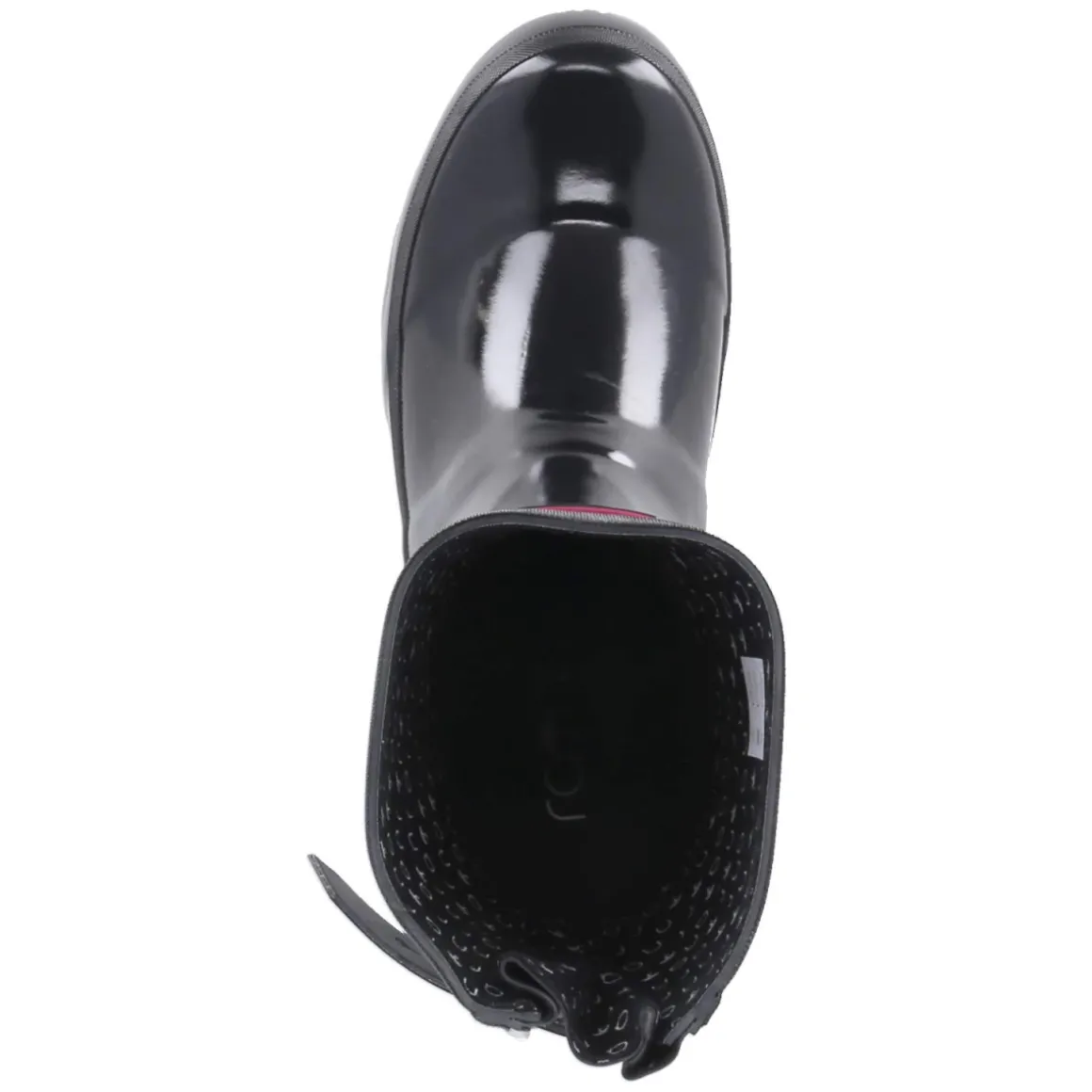 Der Damen-Gummistiefel GLOSSY von Rajn verbindet funktionale Wettertauglichkeit mit moderner Ausstrahlung. Das glänzende Obermaterial aus Gummi in klassischem Schwarz setzt die Lackoptik überzeugend in Szene, während rosa Details einen frischen Akzent geben. Die runde Schuhspitze, der 3 cm hohe Blockabsatz und ein gepolstertes, herausnehmbares Wechselfußbett sorgen für angenehmen Komfort im Alltag. Dank wasserabweisender Verarbeitung, verstärktem Fußrahmen und rutschhemmender, flexibler Profilsohle bleibt der Auftritt selbst bei Nässe sicher. Der variabel anpassbare Schaft gewinnt über den rückseitigen Riemen bis zu 11 cm an Weite und erleichtert das Tragen über Jeans oder Leggings. Eine verstärkte Ferse mit Reflektorstreifen erhöht die Sichtbarkeit in der Dämmerung. Die pflegeleichte Oberfläche sowie die normale Passform runden das Gesamtpaket ab. Modetipp: Zu Trenchcoat und Strickkleid entsteht ein urbaner Look, der Regenwetter stilvoll meistert.