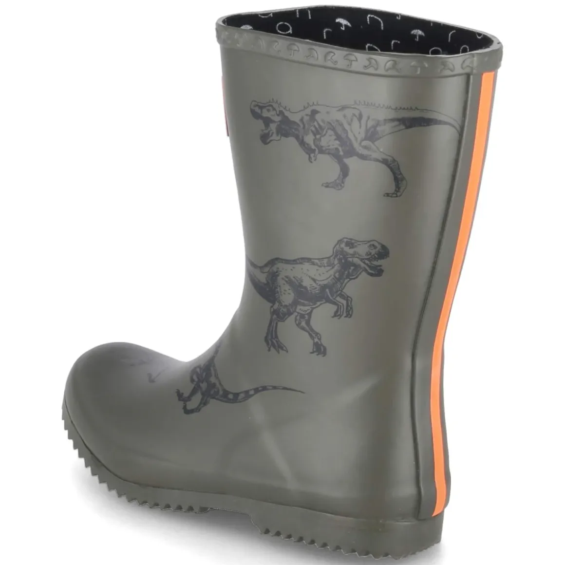 Mit dem grünen Gummistiefel von Rajn wird jedes Regenabenteuer zum Vergnügen. Das wasserfeste Obermaterial aus Gummi schützt zuverlässig, während das bedruckte Design mit verschiedenen Dinos in dezentem Schwarz spielerische Akzente setzt. Die runde Spitze und der Verzicht auf einen Verschluss sorgen für unkomplizierten Einstieg, der verstärkte hintere Schaft mit orangefarbenen Streifen gibt zusätzliche Stabilität. Innen bietet ein dünnes Textilfutter ein angenehmes Klima, das gepolsterte Wechselfußbett mit Textildecksohle erhöht den Komfort und lässt sich für individuelles Tragen herausnehmen. Die flexible, rutschfeste Profilsohle gewährleistet sicheren Halt auf nassem Untergrund. Der Schuh fällt normal aus und zeigt vielfältige Kombinationsmöglichkeiten. Modetipp: Besonders harmonisch zu gelber Regenjacke und dunkelblauer Jeans, dazu eine passende Mütze in Orange als Farbakzent.