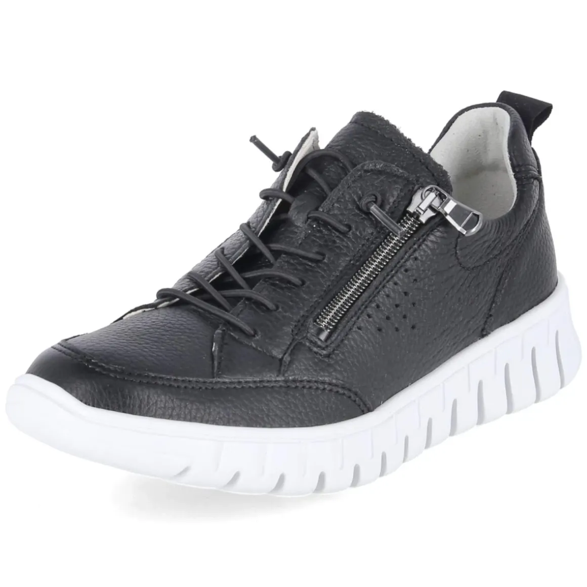 Der Halbschuh BIRDY von Waldläufer vereint sportliche Lässigkeit und durchdachten Komfort. Schwarzes Glattleder in langlebiger Qualität formt eine runde Spitze und umschließt Fuß und Ferse mit verstärkten Zonen, während die lederne Decksohle und das komfortable Wechselfußbett ein angenehmes Klima und individuelle Dämpfung bieten. Dank Elastikschnürung und seitlichem Reißverschluss gelingt der Einstieg mühelos; eine Anziehlasche unterstützt zusätzlich. Das relaxt leichte Tragegefühl trifft auf eine sehr flexible, rutschfeste Laufsohle, die stabilen Halt im Alltag gibt. Das Modell fällt normal aus und richtet sich an Damen, die Wert auf Funktion, Passform und ein klares, sportliches Design legen. BIRDY begleitet durch lange Tage, vom Weg ins Büro bis zum Wochenendeinsatz. Modetipp: Mit cropped Jeans, feinem Stricksweater und Ledergürtel entsteht ein moderner City-Look mit subtiler Eleganz.