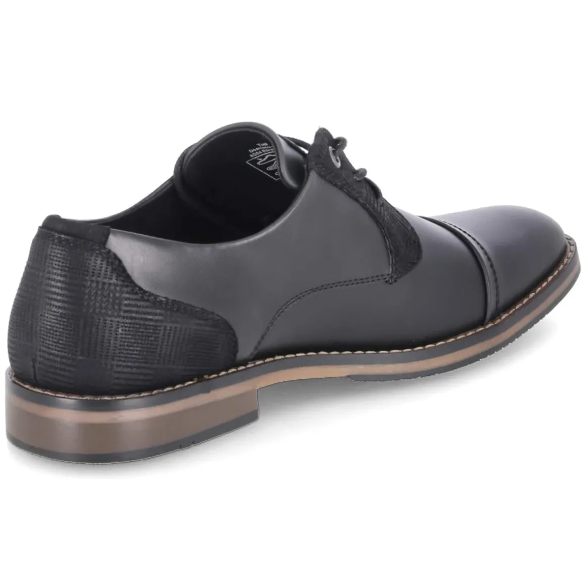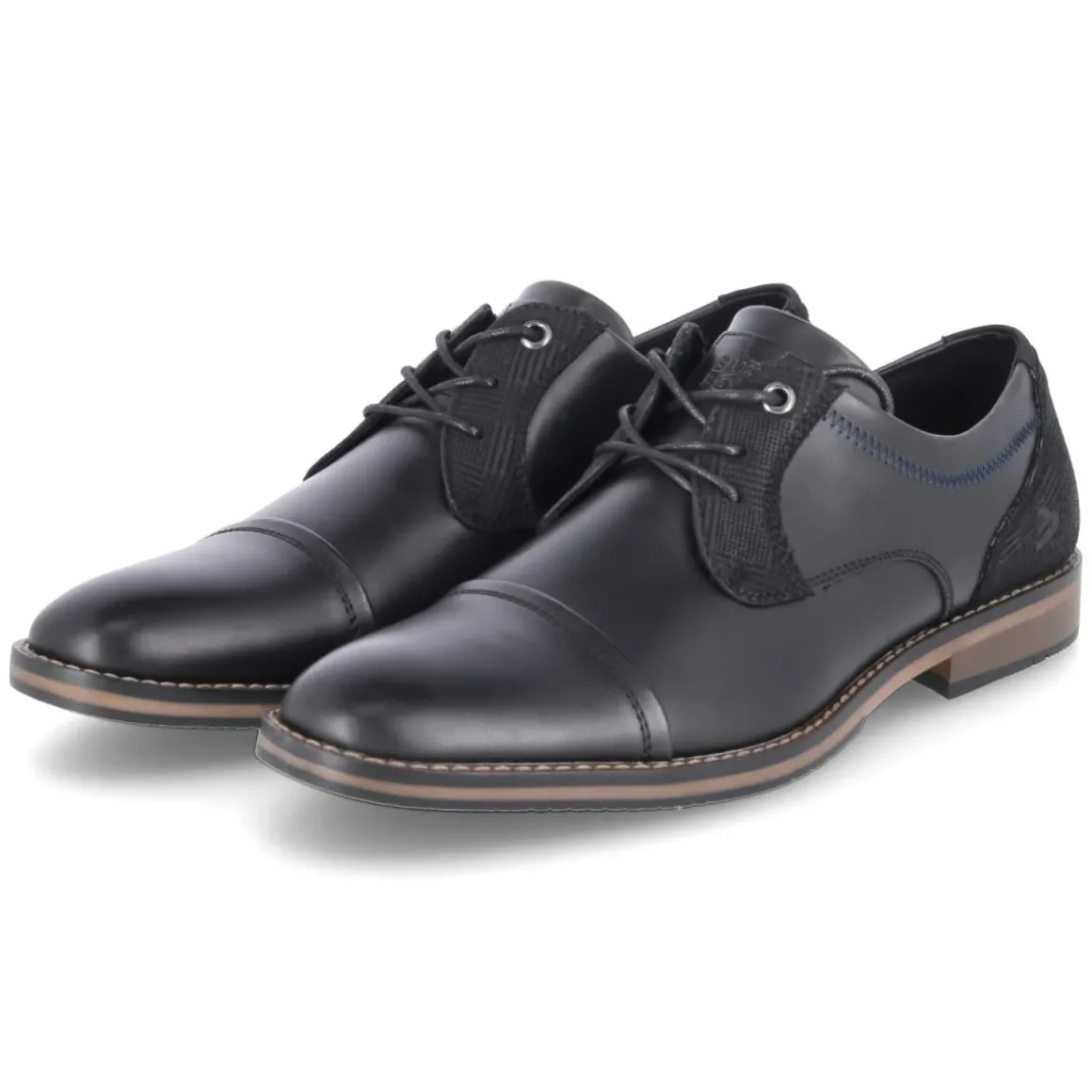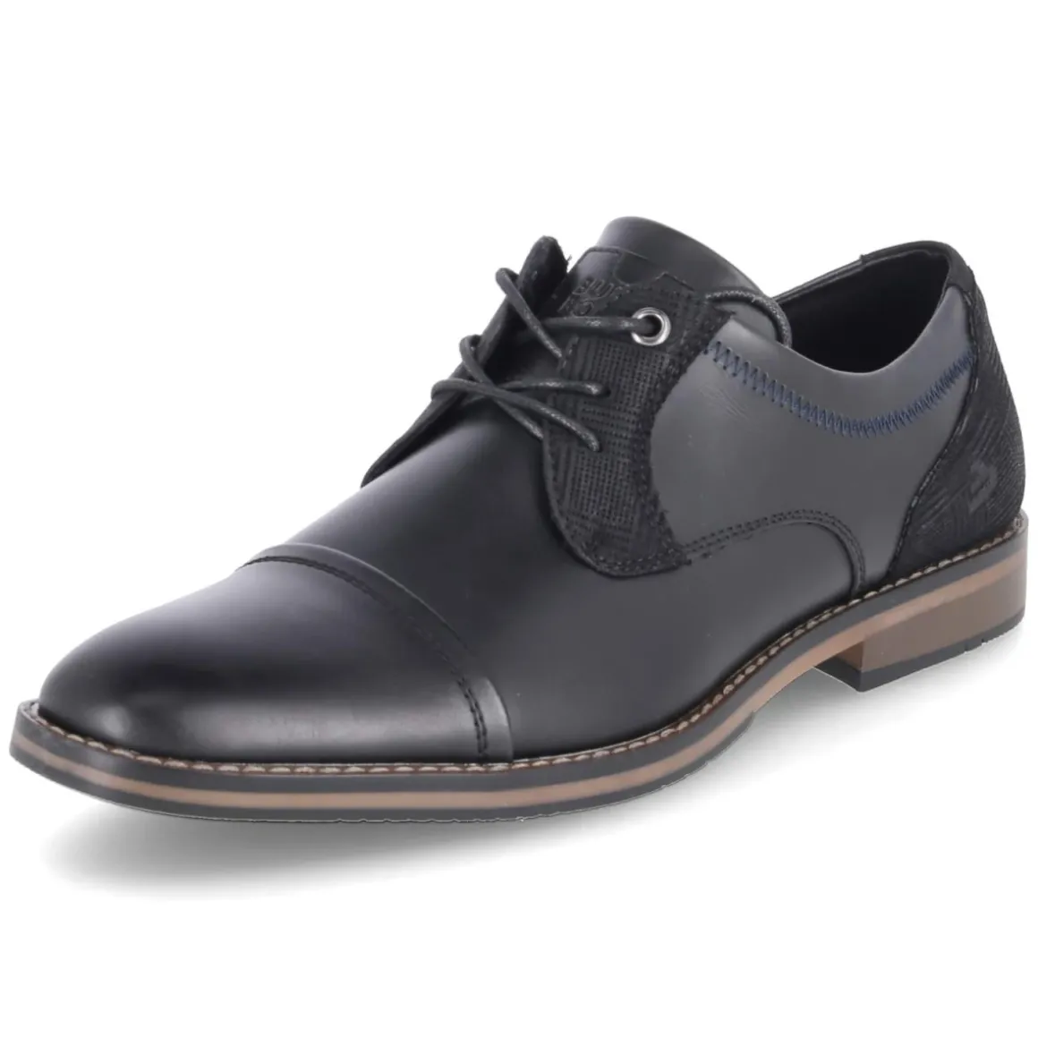 Der schwarze Herren-Halbschuh von Bullboxer verbindet zeitlose Eleganz mit durchdachtem Komfort. Die pflegeleichte Synthetikoberfläche erhält durch blaue Highlights und eine dezente Karoprägung am Blatt eine moderne Note, während Toecap und runde Spitze die klassische Linie bewahren. Die kurze Schnürung sorgt für eine klare Silhouette, der 2,5 cm hohe Blockabsatz bietet stabilen Stand. Innen überzeugt ein textiles Futter mit gepolstertem, herausnehmbarem Wechselfußbett, das zusammen mit der flexiblen, rutschfesten Laufsohle mit leichtem Profil alltagsfreundliche Bequemlichkeit liefert. Handcrafted-Anmutung und elegante Optik machen das Modell bürotauglich und abendtauglich zugleich. Größenhinweis: fällt schmaler aus, daher eine Nummer größer bestellen. Modetipp: Besonders stimmig zu Slim-Fit-Chino in Graphit und ungefüttertem Navy-Sakko.