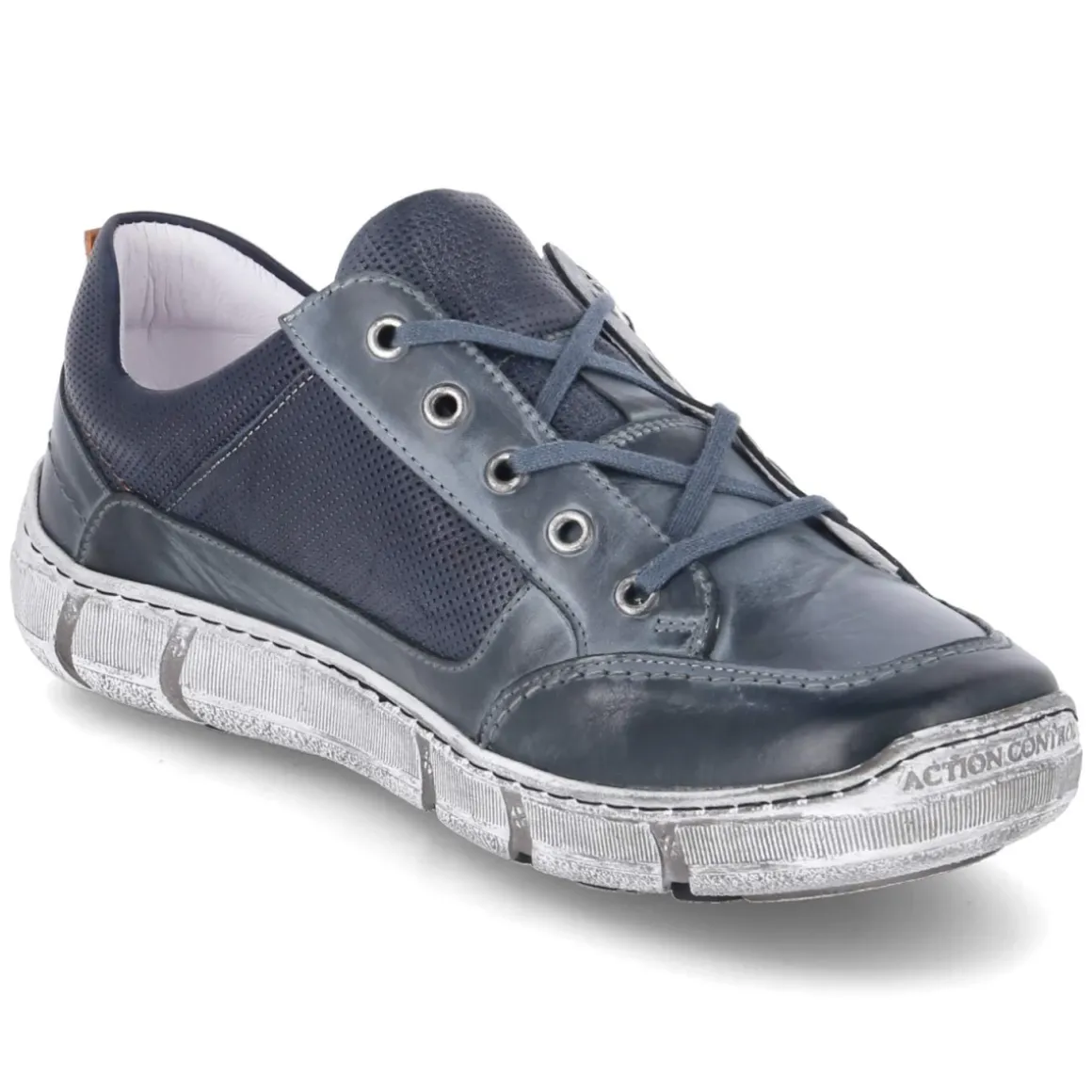 Dieser Herren-Halbschuh von Krisbut bringt sportliches Design und lässige Optik überzeugend zusammen. Dunkelblaues Glattleder mit Used-Look verleiht Charakter, der orangefarbene Seitenstreifen setzt einen frischen Akzent. Das robuste Echtleder und der verstärkte Zehen- und Fersenbereich sorgen für Strapazierfähigkeit im Alltag. Die runde Schuhspitze und die flexible Laufsohle unterstützen einen natürlichen Abrollvorgang, während das komfortable Wechselfußbett individuell anpassbare Dämpfung bietet. Durch die Kombination aus Schnürsenkeln und Reißverschluss gelingt der Einstieg besonders bequem und sicher. Eine Decksohle aus Leder sorgt für ein angenehmes Fußklima, die Passform fällt normal aus. Ob zum Wochenendbummel oder ins Büro, dieser Halbschuh beweist Vielseitigkeit und Komfort. Modetipp: Zu Slim-Jeans in Dunkelwaschung und einem leichten Strickpullover tragen, dazu eine graue Overshirt-Jacke für einen urbanen Look mit smarter Note.