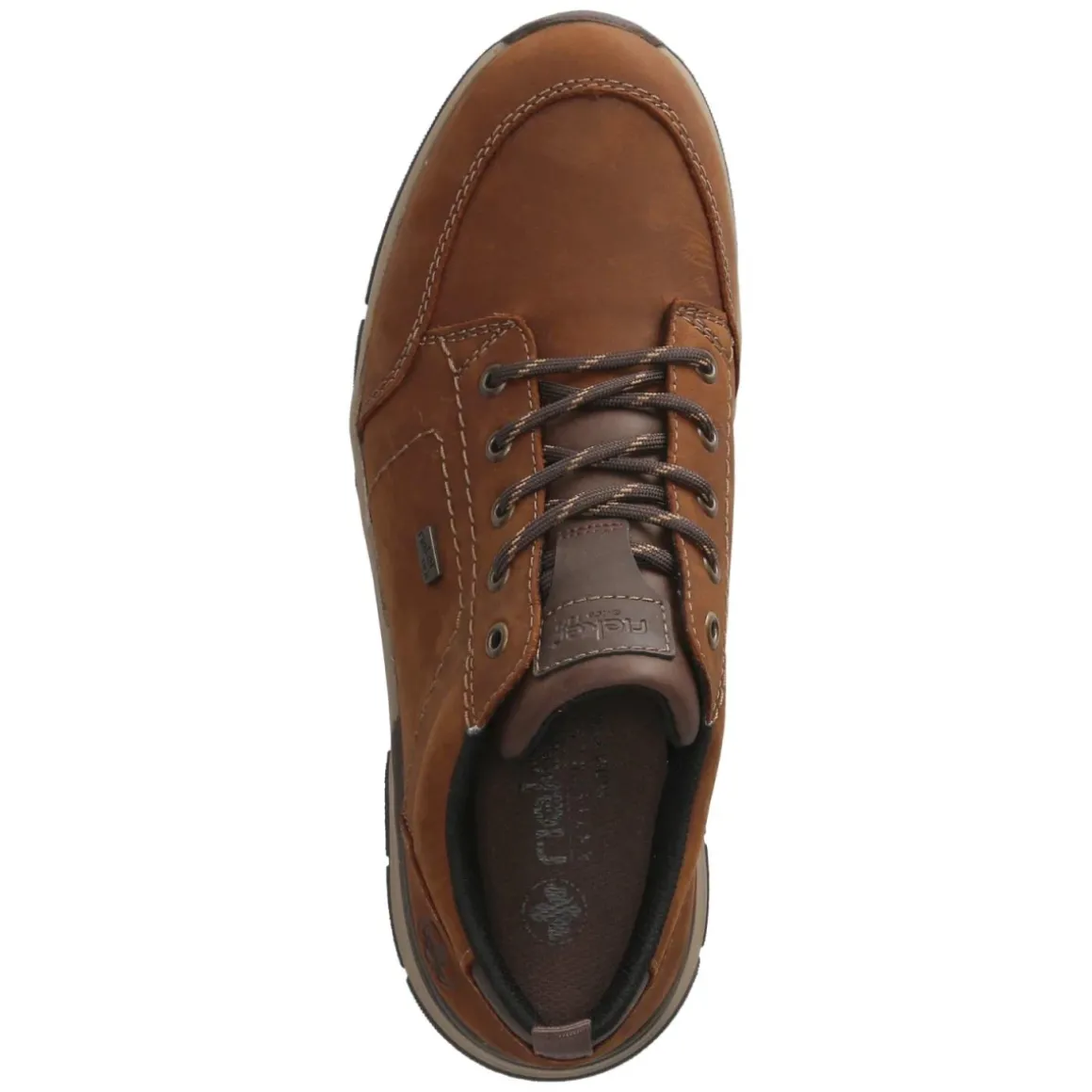 Der braune Rieker-Halbschuh verbindet wetterfeste Funktion und entspannten Casual-Charme. Weiches Rauleder mit rustikalen Ziernähten verleiht eine markante Optik, während die wasserabweisende, wasserfeste Verarbeitung und das atmungsaktive Innenleben für ein angenehmes Klima sorgen. Die runde Schuhspitze bietet Zehenfreiheit, der gepolsterte Einstieg erhöht den Komfort bei jedem Schritt. Dank Schnürung lässt sich die Passform individuell regulieren; das Wechselfußbett mit textiler Decksohle ist weich gepolstert und kann unkompliziert gegen eigene Einlagen getauscht werden. Die flexible, griffige Laufsohle gibt sicheren Halt auf nassem Untergrund. Mit Anziehlasche und dezenten Markendetails abgerundet, fällt dieses Herrenmodell größengetreu aus. Modetipp: Zu dunkler Denim und einem Flanellhemd entsteht ein lässiger, wetterfester Alltagslook.