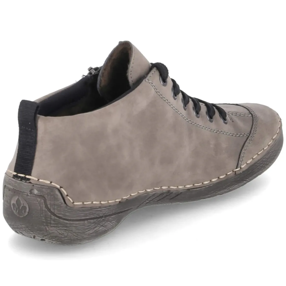 Der graue Rieker Halbschuh vereint lässige Alltagstauglichkeit mit durchdachtem Komfort. Das pflegeleichte Obermaterial aus Synthetik zeigt eine dezente Struktur, die dem Ton-in-Ton-Design Tiefe verleiht. Eine runde Schuhspitze betont den entspannten Charakter, während die Decksohle aus Textil und das leichte Warmfutter für angenehmes Klima an kühlen Tagen sorgen. Praktisch wird es dank der Kombination aus Schnürung und zusätzlichem Reißverschluss, die ein schnelles An- und Ausziehen ermöglicht, ohne auf einen sicheren Sitz zu verzichten. Der Schnitt fällt normal aus und gibt genügend Raum für bequemen Auftritt. Ideal im urbanen Alltag, auf dem Weg ins Büro oder beim entspannten Stadtbummel. Modetipp: Zu geraden Jeans, einem Feinstrickpullover und einem grauen Wollmantel entsteht ein harmonisch tonaler Look mit moderner Ruhe.