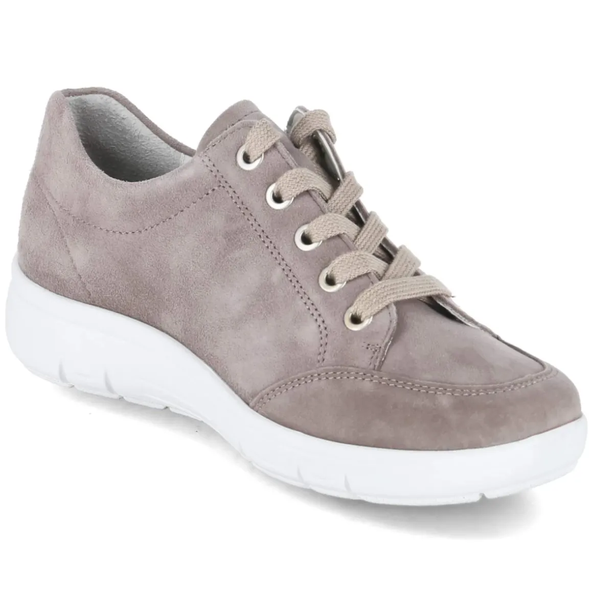 Dieser Damen-Halbschuh von Semler verbindet sportliches Design mit durchdachtem Komfort. Weiches Rauleder in elegantem Taupe legt sich geschmeidig um den Fuß, die runde Spitze bietet entspanntes Platzgefühl. Die Kombination aus Schnürsenkeln und praktischem Reißverschluss ermöglicht schnelles An- und Ausziehen sowie eine passgenaue Regulierung. Innen sorgt eine vorgeformte, textile Decksohle für angenehme Stützung; das Wechselfußbett lässt sich bei Bedarf gegen eigene Einlagen tauschen. Fersen- und Zehenbereich sind verstärkt, die flexible, rutschfeste Laufsohle gibt verlässlichen Halt im Alltag. Das langlebige Echtleder und die solide Verarbeitung begleiten zuverlässig durch viele Saisons. Der Schuh fällt normal aus und überzeugt erwachsene Trägerinnen, die Wert auf Komfort und Stil legen. Modetipp: Zu Cropped-Denim und einer fließenden Bluse entsteht ein smarter City-Look, der das Taupe ideal betont.