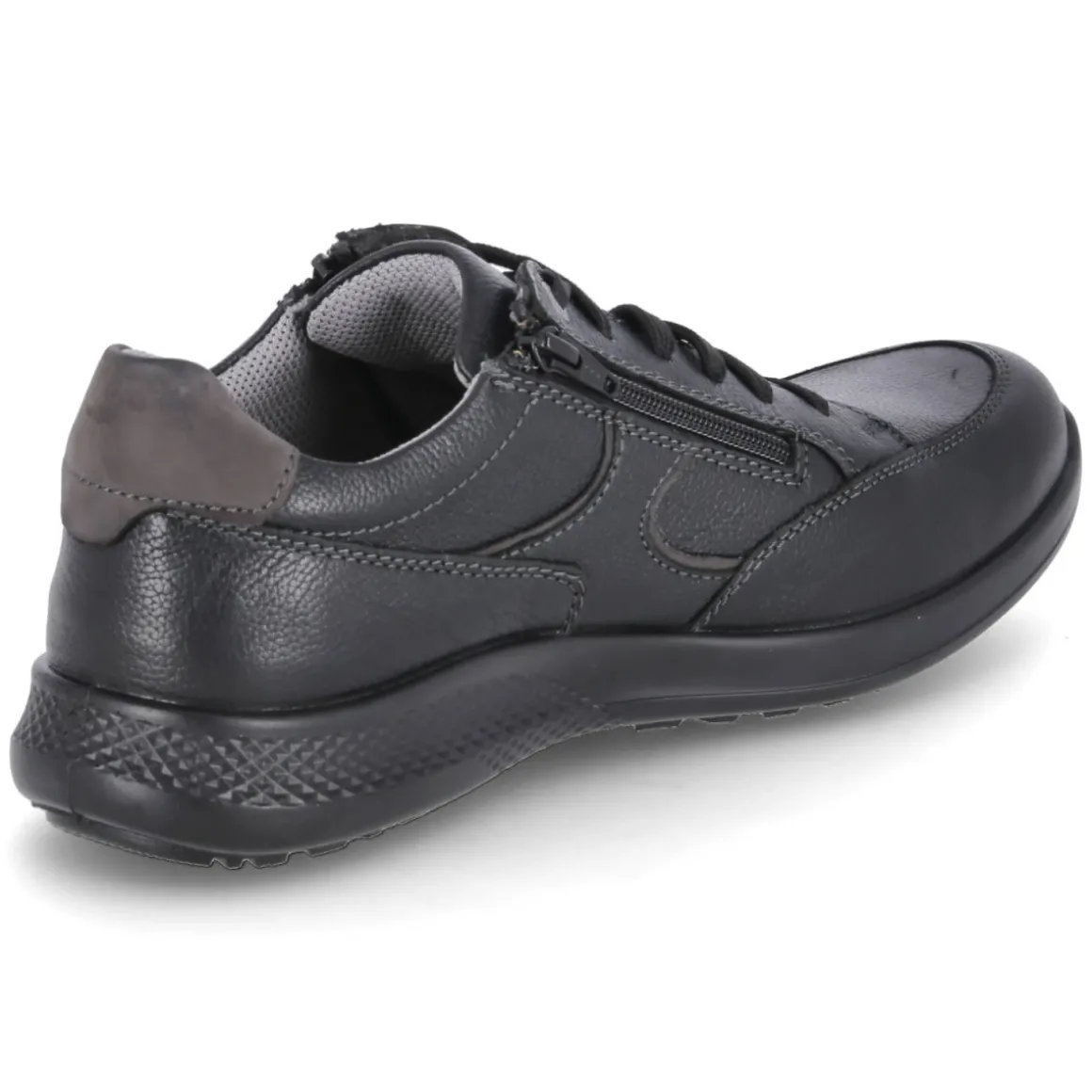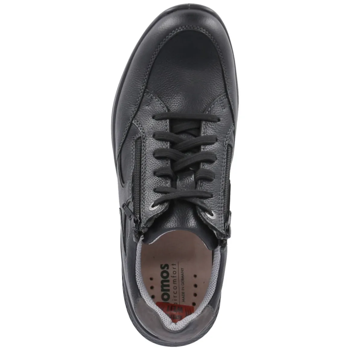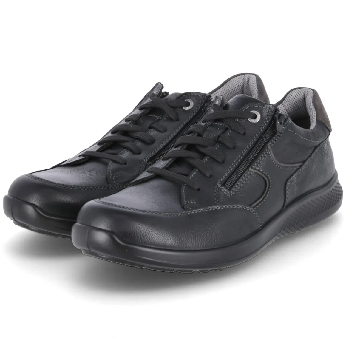 Klassischer Auftritt und komfortabler Alltagspartner: Der schwarze Halbschuh von Jomos verbindet elegantes Glattleder mit durchdachten Details. Das langlebige Echtleder verleiht eine wertige Optik, die runde Schuhspitze sorgt für angenehme Zehenfreiheit. Schnürsenkel garantieren den passgenauen Sitz, der zusätzliche Reißverschluss ermöglicht ein schnelles An- und Ausziehen. Innen überzeugt eine Decksohle aus Leder, die ein angenehmes Tragegefühl unterstützt. Das komfortable Wechselfußbett bietet Flexibilität, etwa beim Einsatz eigener Einlagen. Die Passform fällt normal aus und macht den Schuh zum unkomplizierten Begleiter für Büro und Freizeit. Modetipp: Zu schmalen Chinos und einem feinen Strickpullover entsteht ein zeitloser Look, der mit einem schwarzen Ledergürtel perfekt abgerundet wird.