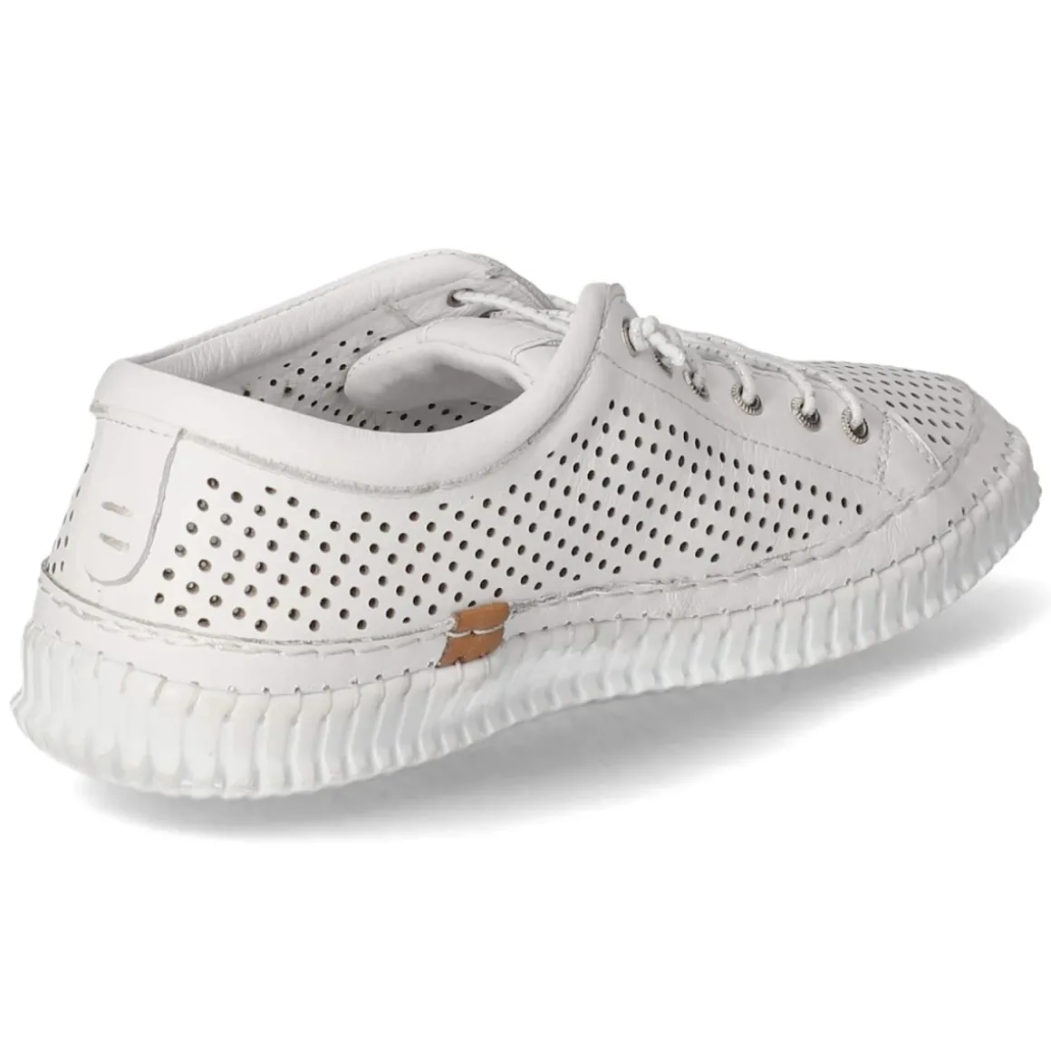 Der Damen-Halbschuh von Andrea Conti präsentiert sich in zeitlosem Weiß als lässig-sportlicher Allrounder. Glattes, atmungsaktives Echtleder mit fein gelochtem Muster sorgt für ein angenehm kühles Fußklima, während rustikale Ziernähte und die runde Kappe dem Design charaktervolle Leichtigkeit verleihen. Die Kombination aus klassischer Schnürung und praktischer Elastikschnürung ermöglicht eine passgenaue Weitenregulierung und erleichtert den Einstieg, der zusätzlich weich gepolstert ist. Innen verwöhnt eine Lederdecksohle, das gepolsterte, auswechselbare Fußbett bietet individuellen Komfort, auch für eigene Einlagen. Die flexible, rutschhemmende Laufsohle begleitet sicher durch den Alltag. Das Modell fällt normal aus und passt zu Freizeit wie Büro. Modetipp: Mit Cropped-Jeans, Streifenhemd und leichtem Trench entsteht ein frischer City-Look.
