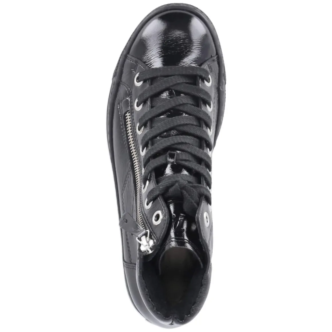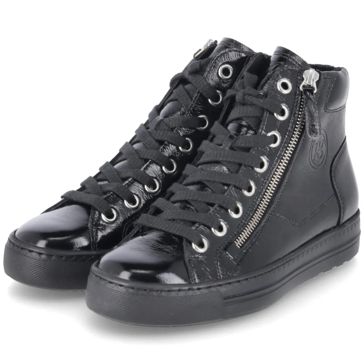 Der High Sneaker von Paul Green bringt elegante Lackoptik und sportliche Leichtigkeit in Einklang. Das glänzende Obermaterial aus schwarzem Lackleder inszeniert den High-Top mit moderner Note, während die runde Spitze und die klare Linienführung zeitlose Zurückhaltung vermitteln. Innen unterstützt eine weiche Lederdecksohle den Tragekomfort, der durch den gepolsterten Einstieg und die verstärkte Ferse spürbar verlängert wird. Für praktischen Halt sorgen Schnürsenkel in Kombination mit einem seitlichen Reißverschluss, die individuelle Weitenregulierung und schnelles An- und Ausziehen ermöglichen. Die rutschhemmende Laufsohle und die robuste Cupsohle mit schützenden Bumpern sichern souveränen Grip im urbanen Alltag. Das Modell fällt normal aus und richtet sich an Damen, die einen smarten Begleiter für vielseitige Looks schätzen. Modetipp: Zu schmal geschnittenen Cropped-Jeans und einem Oversize-Blazer entsteht ein spannender Kontrast aus Glanz und Struktur.
