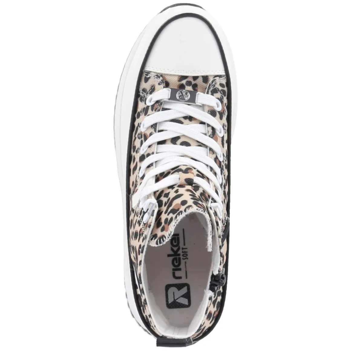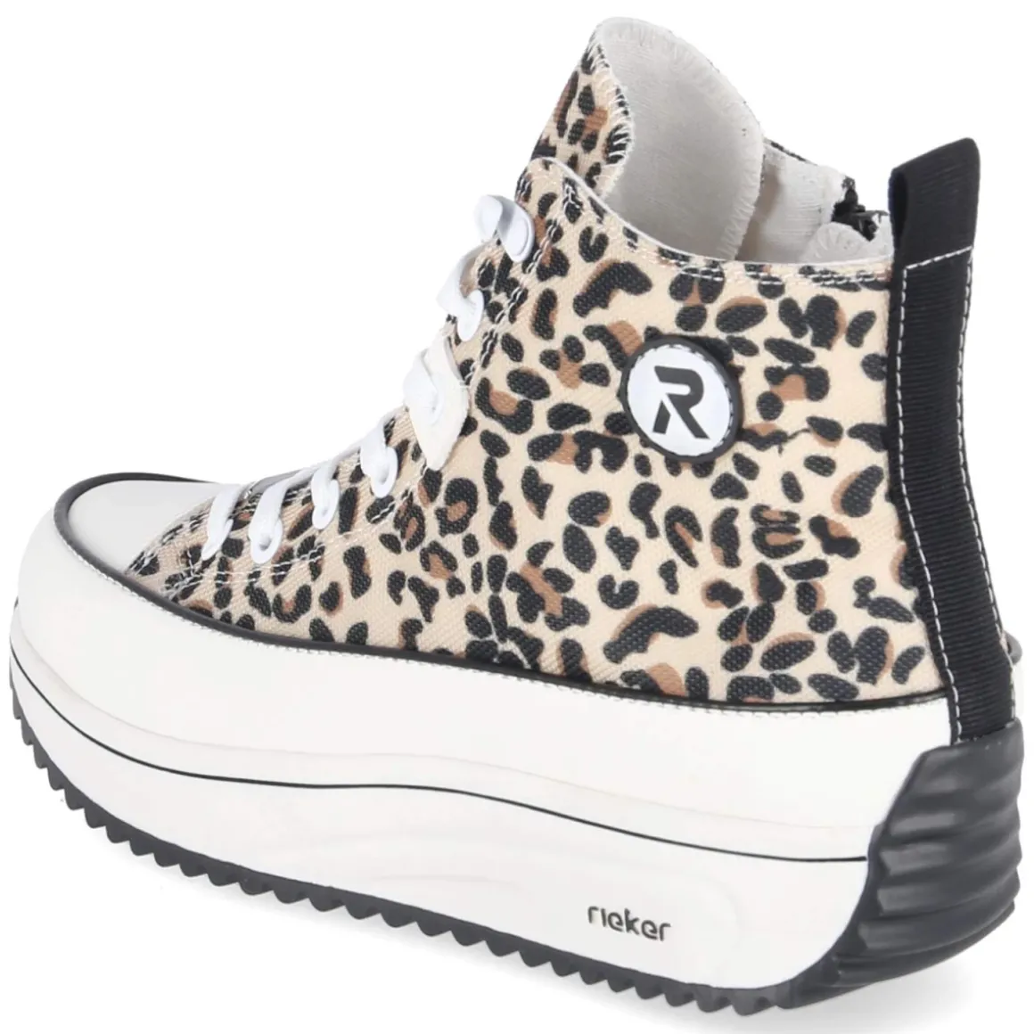 Dieser High Sneaker von Rieker verbindet urbanen Chic mit komfortabler Funktion. Gefertigt aus veganen Materialien zeigt das Modell eine beigefarbene Basis, die vom markanten Leopardenmuster raffiniert akzentuiert wird. Der hohe Schaft und der umlaufende Schutzrand mit Plateauoptik verleihen eine moderne Silhouette, während die runde Schuhspitze lässigen Street-Style unterstreicht. Obermaterial aus Textil und Synthetik, textile Decksohle sowie ein weich gepolstertes, herausnehmbares Fußbett stehen für angenehmes Tragen über viele Stunden. Doppelter Verschluss aus Schnürung und zusätzlichem Reißverschluss plus praktische Anziehlasche erleichtern den Einstieg. Die rutschfeste Laufsohle sorgt für sicheren Tritt auf wechselnden Untergründen. Ein modisches Statement, das Komfort und Design souverän verbindet. Modetipp: Zu verkürzten Straight-Jeans und einem lockeren Strickpullover in Creme wirkt der Sneaker besonders frisch.