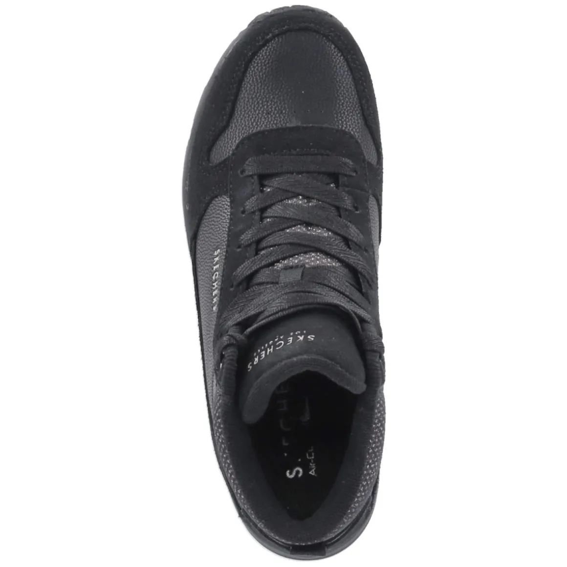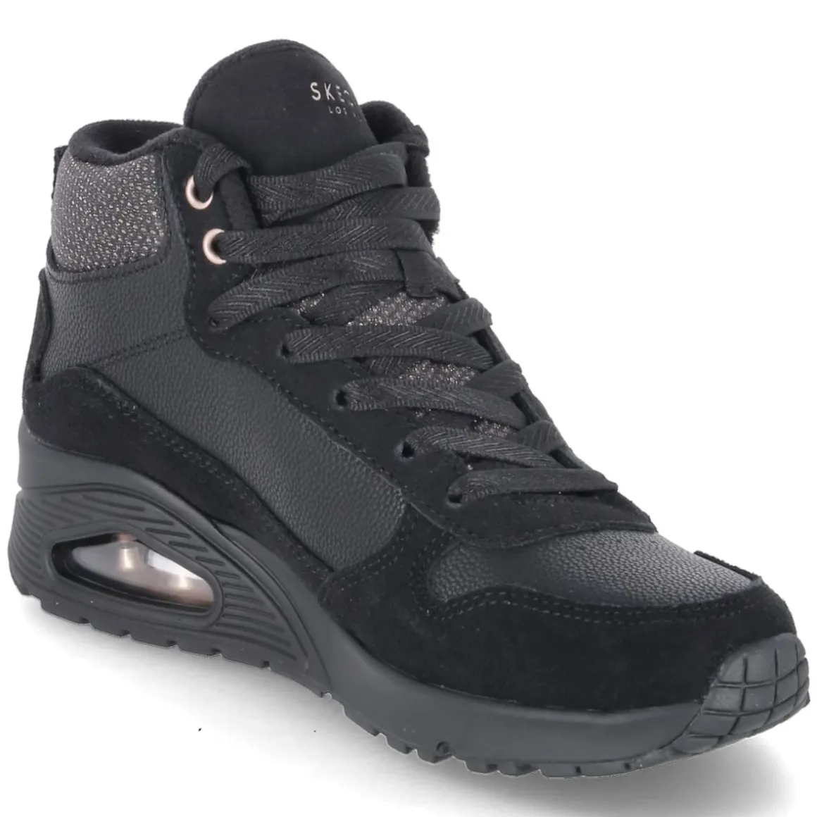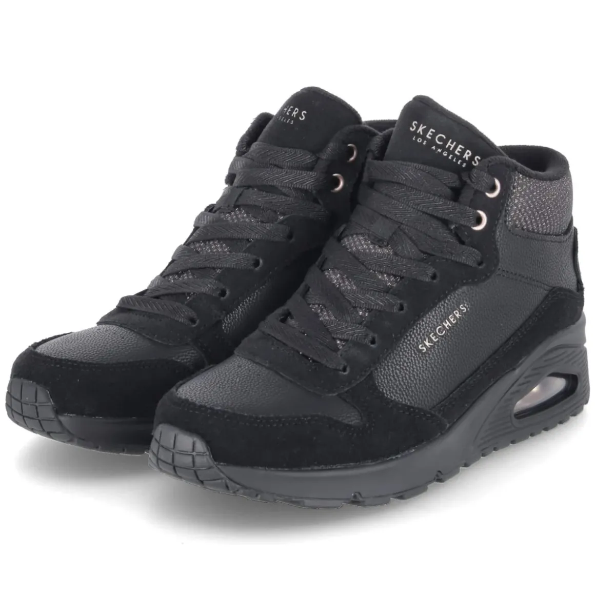 Der High Sneaker UNO-STARCE SHINE von Skechers verbindet urbanen Chic mit durchdachtem Komfort. Der moderne Material-Mix aus Leder und Synthetik trifft auf golden schimmernde Highlights, die auf dem tiefschwarzen Upper edel zur Geltung kommen. Die hohe Silhouette mit runder Spitze umschließt den Fuß sicher, während das beste Memory-Foam-Fußbett und die textile Decksohle soft abfedern. Die flexible, rutschfeste Laufsohle mit Sichtfenster in der Ferse unterstützt ein angenehmes Abrollen, der Zehen- und Fersenbereich ist robust verstärkt. Eine klassische Schnürung wird durch praktische Klettdetails sinnvoll ergänzt und erleichtert das An- und Ausziehen. Leichtes Futter macht den Sneaker zur smarten Wahl für kühle Tage. Fällt normal aus. Modetipp: Mit Cropped-Jeans, Oversize-Blazer und feinen Stricksocken entsteht ein moderner City-Look, der die goldenen Akzente stilvoll aufgreift.