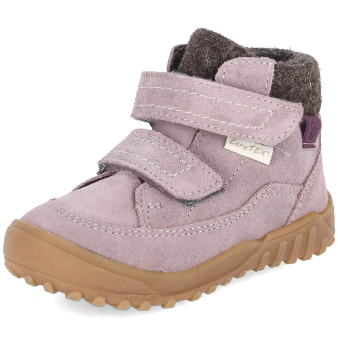 Der Klettboots DONTE von Pepino setzt auf zuverlässige Funktion und kindgerechten Komfort. Weiches Rauleder in kräftigem Lila trifft auf warmes, aber leichtes Futter – ideal für kühle Tage. Die Kombination aus wasserfesten Eigenschaften und atmungsaktiver Ausstattung hält kleine Füße angenehm trocken. Dank praktischer Klettverschlüsse gelingt das An- und Ausziehen im Handumdrehen, während die runde Schuhspitze ausreichend Zehenfreiheit bietet. Die flexible, rutschfeste Laufsohle mit robuster Zehenkappe gibt Halt auf rutschigen Wegen, der verstärkte Zehen- und Fersenbereich sorgt für zusätzliche Stabilität. Ein weicher Filzeinstieg schmiegt sich sanft an, die textile Decksohle und das herausnehmbare Fußbett unterstützen bequemes Tragen. Der Schnitt fällt normal aus und ist damit alltagstauglich für aktive Kleinkinder. Modetipp: Zu Strickleggings, Jeans-Latzhose und farblich abgestimmter Softshelljacke entsteht ein harmonischer Herbst-Look mit frischem Farbakzent.
