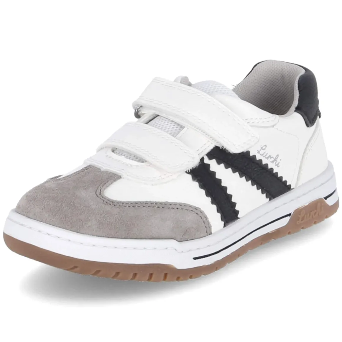 Die weißen Lurchi Klettschuhe für Kinder verbinden einen robusten Material-Mix aus Leder und Synthetik mit durchdachter Funktion. Zwei Klettriemen sorgen für schnellen Einstieg und sicheren Halt, der gepolsterte Schaftrand entlastet den Fuß im Alltag. Schwarze Seitenstreifen setzen sportliche Akzente, die runde Schuhspitze und der verstärkte Zehen- und Fersenbereich geben zusätzlichen Schutz beim Toben. Das gepolsterte, herausnehmbare Wechselfußbett aus Textil schafft angenehmen Tragekomfort und lässt sich bei Bedarf austauschen. Die flexible, griffige und rutschhemmende Laufsohle bietet zuverlässige Traktion auf verschiedenen Untergründen. Mit WMS Schuhweite W und normaler Passform fällt das Modell wie gewohnt aus. Gelabelte Details runden das Design ab und eröffnen gute Kombinationsmöglichkeiten. Modetipp: Zu Denim und Hoodie wirkt der Look lässig, mit farbigen Socken greifen Outfits die schwarzen Streifen stimmig auf.