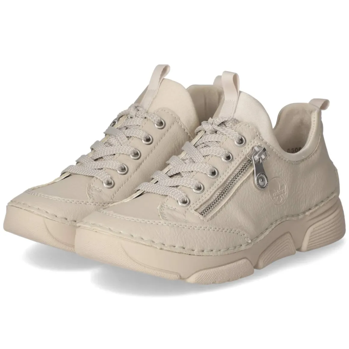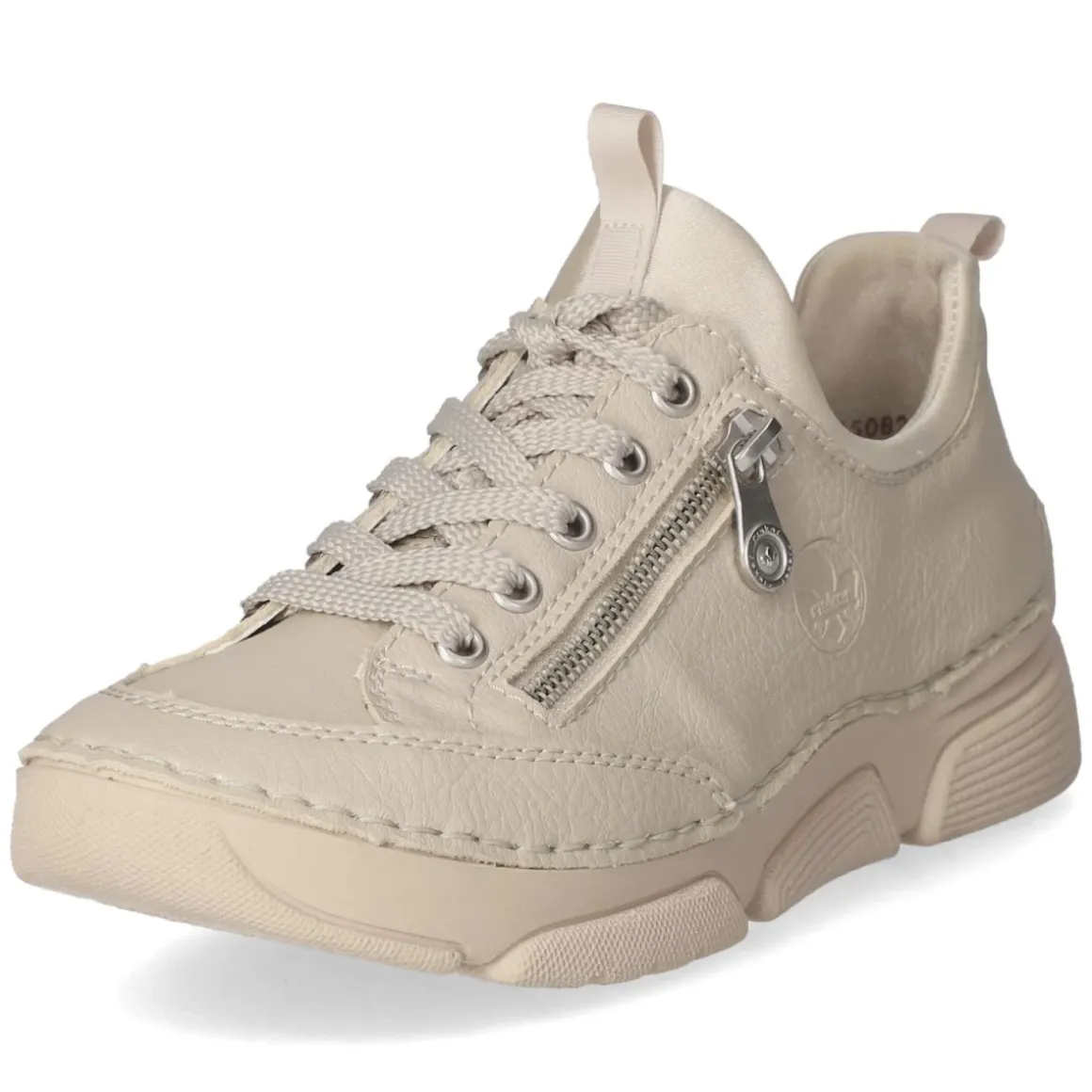 Der beige Low Sneaker von Rieker verbindet unkomplizierten Komfort mit einem cleanen Look für den Alltag. Das runde Leistenbild bietet Zehenfreiheit, während die lederne Decksohle ein angenehm natürliches Fußklima unterstützt. Obermaterial aus Textil und Synthetik präsentiert sich pflegeleicht und behält auch nach vielen Wegen seine Form. Dank Schnürung lässt sich die Passform individuell regulieren; ein Zierreißverschluss setzt einen dezenten Akzent. Zwei Anziehlaschen erleichtern den Einstieg, verstärkte Zehen- und Fersenpartien erhöhen die Stabilität. Die flexible, rutschhemmende Laufsohle sorgt für sicheren Halt auf wechselnden Untergründen. Das Wechselfußbett bietet Spielraum für eigene Einlagen, fällt insgesamt normal aus und trägt den ganzen Tag entspannt. Ein feines Markendetail rundet das Design ab. Modetipp: Mit verkürzter Straight-Jeans, hellen Socken und Trenchcoat entsteht ein moderner, zeitloser City-Look in soften Naturtönen.