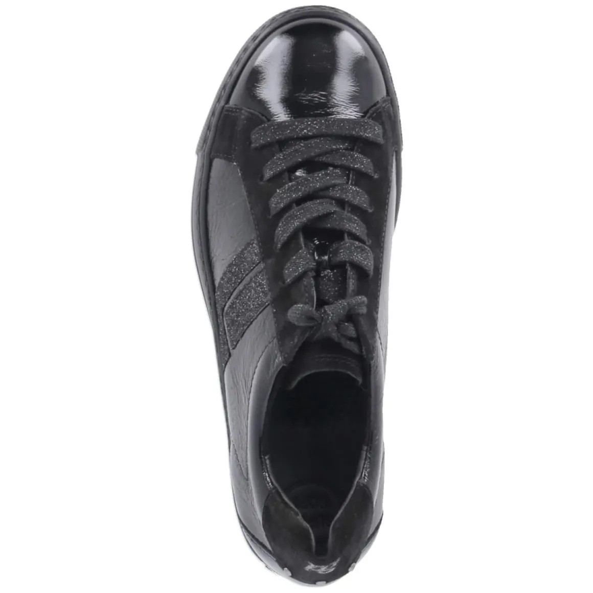 Der Low Sneaker von Paul Green verbindet elegante Lackoptik mit sportlicher Leichtigkeit und setzt in tiefem Schwarz ein souveränes Statement. Der glitzernde Seitenstreifen verleiht dem cleanen Design einen Hauch von Raffinesse, während die runde Spitze und die klassische Schnürung zeitlose Linien bewahren. Für Komfort sorgen die weiche Lederdecksohle und der leicht gepolsterte Einstieg, die bei jedem Schritt sanft abfedern. Die Cupsohle mit Bumpern und kleinem Plateau bringt 3 cm Höhe, ohne an Stabilität einzubüßen, und die rutschhemmende Laufsohle bietet verlässlichen Grip im Alltag. Das Obermaterial aus Leder und Textil verspricht wertige Haptik und Haltbarkeit. In normaler Passform gestaltet, trägt sich der Damensneaker vielseitig von morgens bis abends. Modetipp: Besonders edel wirkt das Modell zu monochromen Looks in Schwarz oder Dunkelgrau, kombiniert mit einer verkürzten Anzughose und einem strukturierten Blazer.