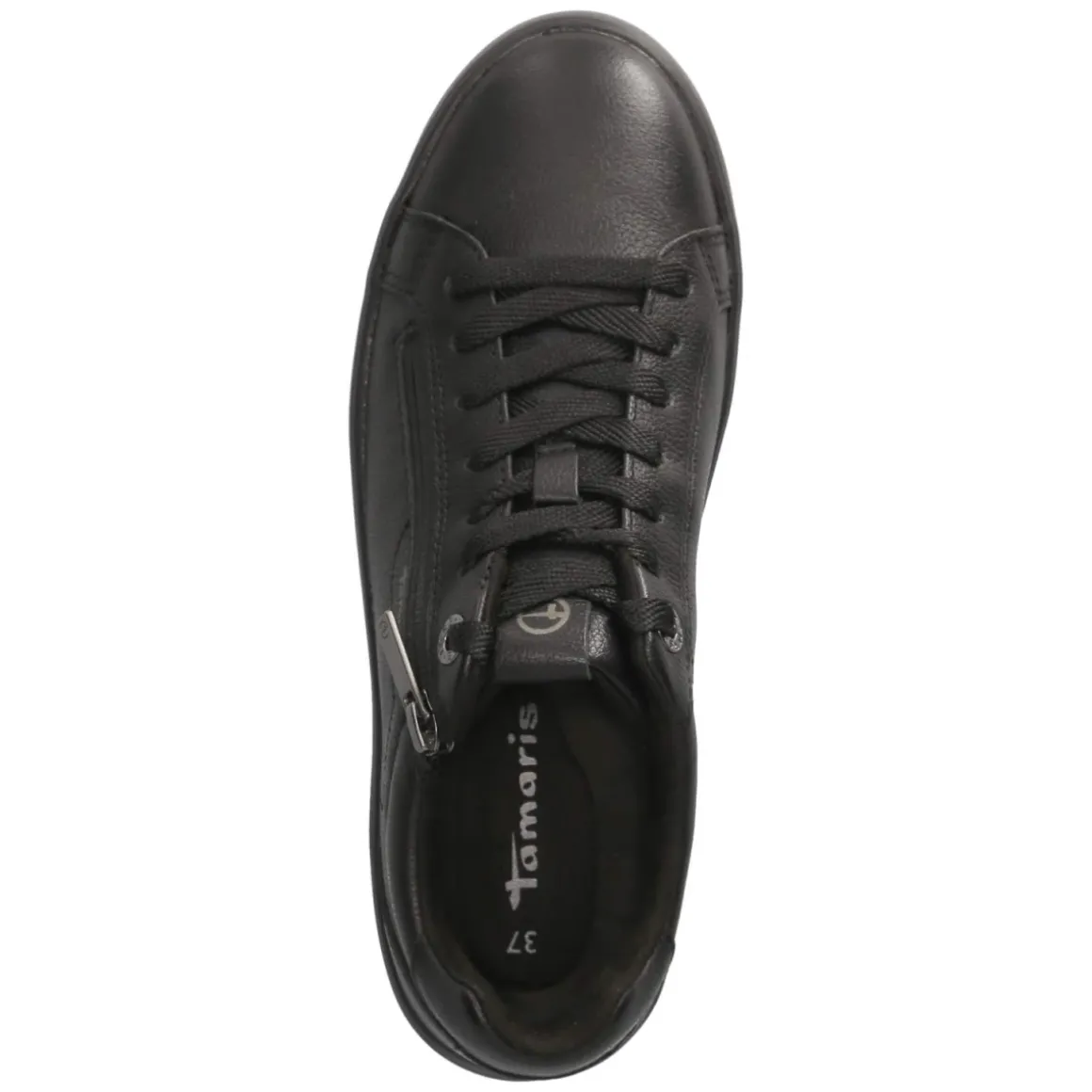 Der Low Sneaker von Tamaris in klassischem Schwarz vereint eine klare, urbane Silhouette mit durchdachtem Komfort. Der robuste Material-Mix aus Leder und Synthetik steht für Formstabilität und eine wertige Haptik, die runde Schuhspitze sorgt für angenehme Zehenfreiheit. Schnürsenkel und zusätzlicher Reißverschluss ermöglichen ein unkompliziertes An- und Ausziehen sowie passgenauen Halt, die Passform fällt normal aus. Ein komfortables Wechselfußbett auf synthetischer Decksohle unterstützt den Fuß und lässt sich bei Bedarf austauschen. Verstärkte Ferse, gepolsterter Einstieg und die flexible, rutschhemmende Laufsohle bieten verlässliche Stabilität auf diversen Untergründen. Dezenter Markenschriftzug unterstreicht den cleanen Look und macht den Sneaker vielseitig kombinierbar. Modetipp: Für einen modernen City-Style mit Cropped-Jeans, weißem Basic-Shirt und Oversize-Blazer tragen; für einen sportlich-eleganten Twist optional mit feinen Rippensocken akzentuieren.