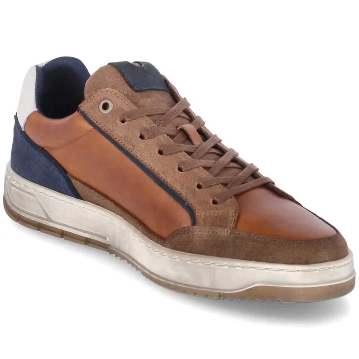 Der Low Sneaker von Bullboxer vereint eine lässige Optik mit robuster Alltagstauglichkeit. Das Obermaterial aus langlebigem Echtleder zeigt sich in warmem Braun und bekommt durch dunkelblaue Highlights eine moderne Note. Die runde Schuhspitze und der klassische Schnürverschluss unterstreichen den zeitlosen Charakter. Ein gepolsterter Einstieg und das weich gepolsterte, herausnehmbare Fußbett sorgen für angenehmen Komfort, während der verstärkte Zehen- und Fersenbereich zusätzliche Stabilität verleiht. Die flexible, rutschhemmende Cupsohle bietet verlässlichen Grip und unterstützt ein natürliches Abrollen. Der Sneaker fällt normal aus und eignet sich ideal für den täglichen Einsatz. Modetipp: Besonders stimmig zu schmalen Chinos in Sand oder Oliv sowie einem dunkelblauen Strickpullover; dazu ein Ledergürtel in Braun für ein harmonisches Finish.