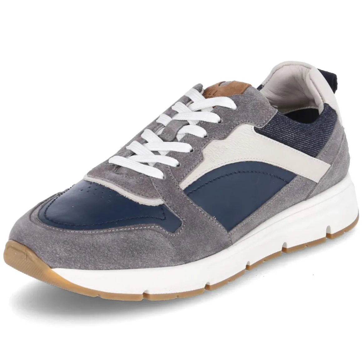 Der Bullboxer Low Sneaker für Herren verbindet einen stilvollen Ledermix in nuanciertem Grau mit sportlicher Linienführung. Der seitliche weiße Streifen setzt einen klaren Akzent zur cleanen, runden Spitze, während die klassische Schnürung sicheren Halt gibt. Mit textiler Decksohle und einem herausnehmbaren, gepolsterten Wechselfußbett bietet das Modell langanhaltenden Komfort; der gepolsterte Einstieg schont den Knöchel. Verstärkter Zehen- und Fersenbereich erhöhen die Formstabilität, die flexible, rutschhemmende Laufsohle sorgt für Grip im Alltag. Die Passform fällt normal aus und lässt Raum für individuelle Einlagen. Dank der zurückhaltenden Farbgebung lässt sich der Sneaker vielseitig kombinieren – von Denim bis Chino und smart-casual Looks. Modetipp: Graue Chino, cremefarbenes Sweatshirt und ein marineblaues Overshirt spielen die Töne des Schuhs elegant aus; weiße Socken greifen den Streifen auf.