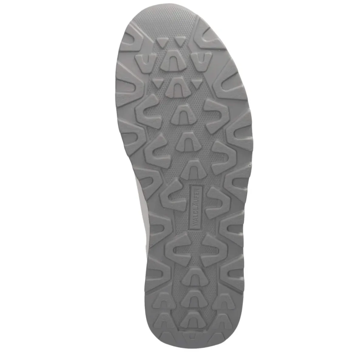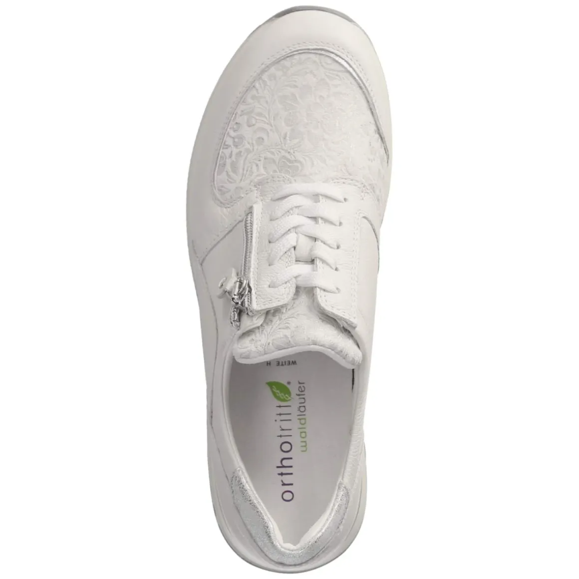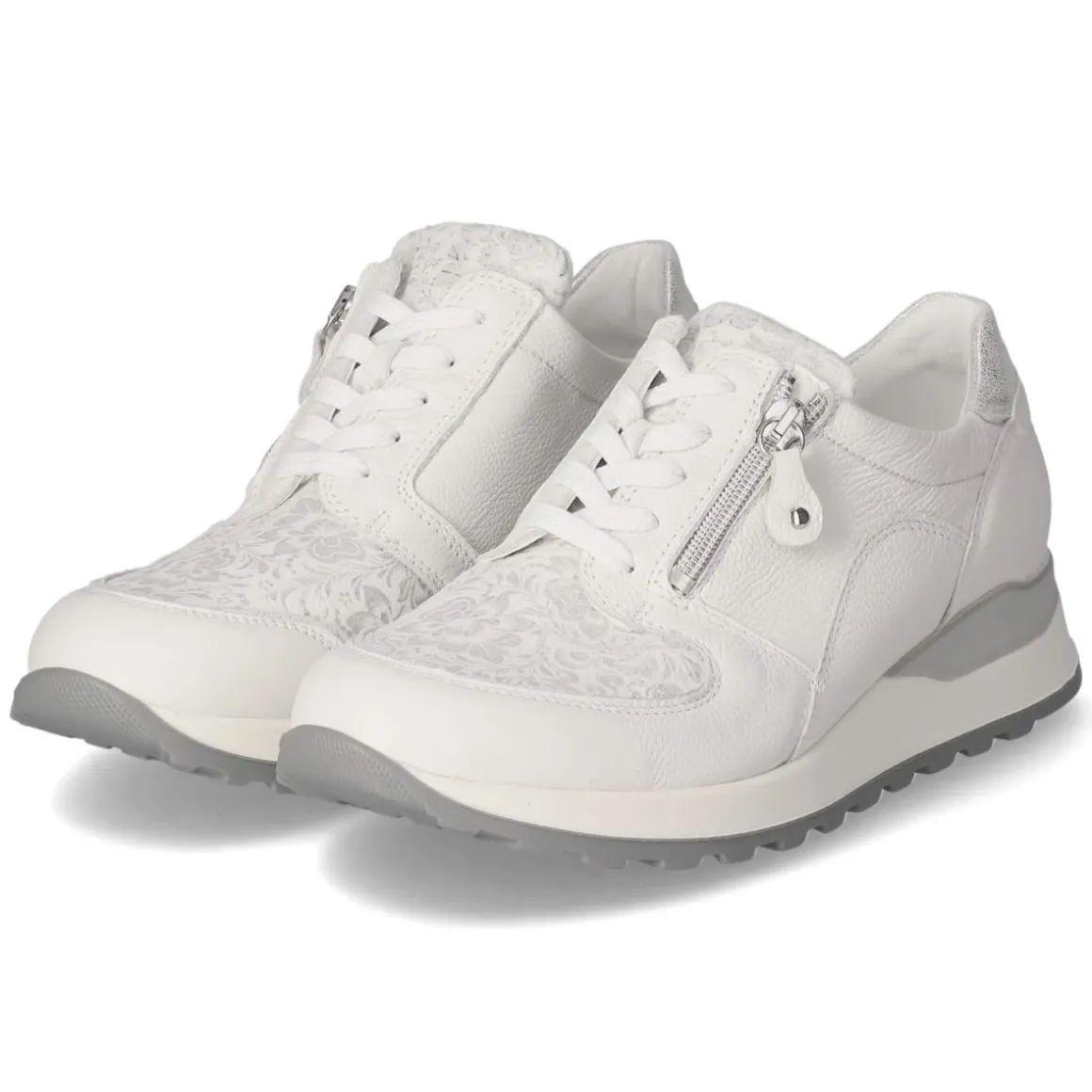 Der Low Sneaker HIROKO von Waldläufer verbindet sportive Linie und fein gearbeitete Details. Weißes Leder und Textil bilden einen robusten Material-Mix, den ein silberfarbenes Blumenmuster und glänzende Akzente modern akzentuieren. Die runde Spitze sorgt für Zehenfreiheit, der gepolsterte Einstieg und die textile Decksohle umschmeicheln den Fuß. Für Komfort im Alltag steht das komfortable Wechselfußbett, das bei Bedarf gegen eigene Einlagen getauscht werden kann. Schnürsenkel schaffen präzisen Halt, der zusätzliche Reißverschluss erleichtert den Einstieg. Eine flexible Laufsohle federt jeden Schritt ab, verstärkte Zehen- und Fersenbereiche geben Stabilität, Ziernähte runden das Design ab. Der Schnitt fällt normal aus und ist auf Damenfüße abgestimmt. Modetipp: Zu Cropped-Chino und Oversize-Blazer entsteht ein cleaner City-Look, den eine silberne Crossbody-Bag stimmig aufgreift.