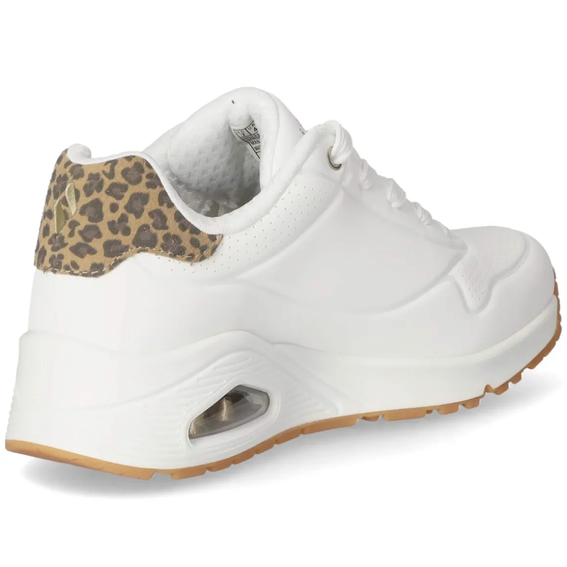 Der Low Sneaker JUNGLE NITE von Skechers verbindet sportliche Klarheit in strahlendem Weiß mit markanten Details. Das pflegeleichte Synthetik-Obermaterial und die textile Decksohle schaffen eine angenehme Basis, während die runde Spitze und die klassische Schnürung mit individueller Anpassung den zeitlosen Look unterstreichen. Beste Memory-Foam-Fußbettung sorgt für weichen Auftritt, der gepolsterte Einstieg erhöht den Tragekomfort im Alltag. Perforierte Partien fördern Luftaustausch, die Fersenklappe im Leopardenprint setzt einen trendigen Akzent. Die flexible, rutschfeste Laufsohle mit Grip und Sichtfenster begleitet zuverlässig durch urbane Wege. Fällt normal aus und überzeugt mit dezenten Markendetails. Modetipp: Zu Cropped-Jeans, weißem T-Shirt und Oversize-Blazer entsteht ein cleaner City-Look, den eine Leoparden-Bag stilvoll aufgreift.