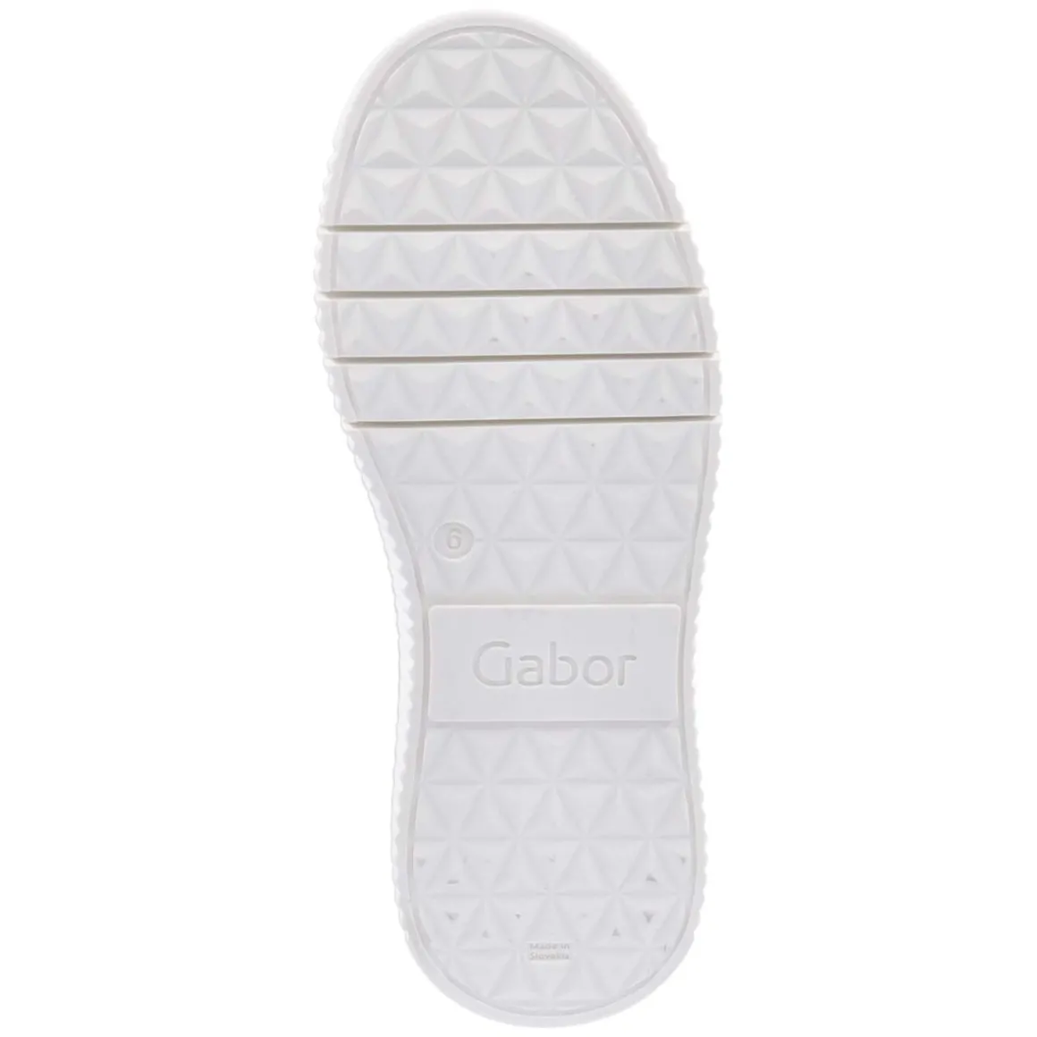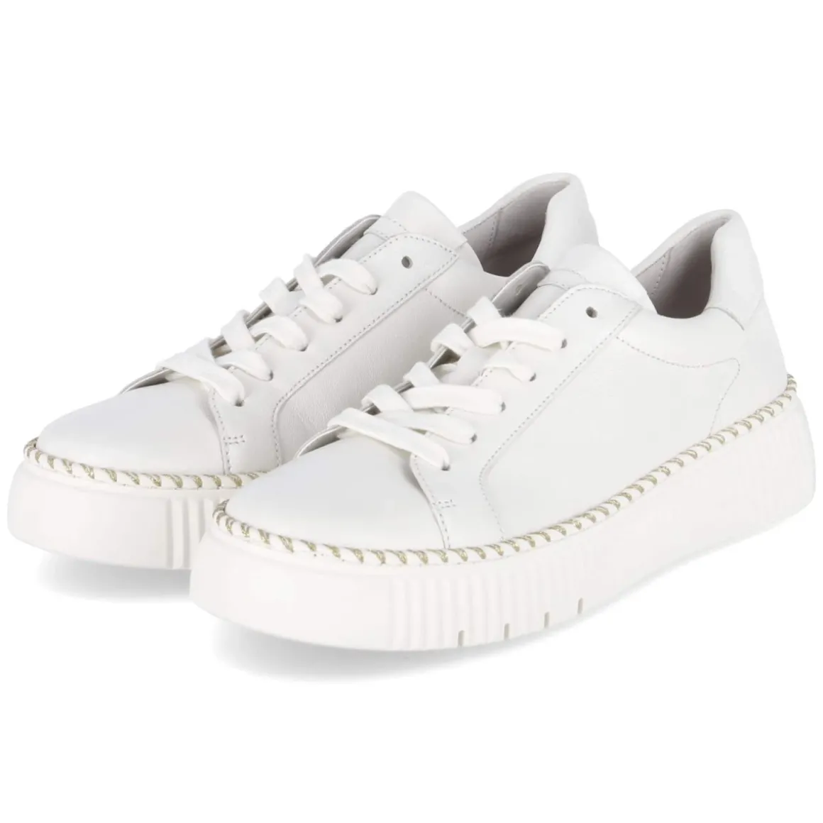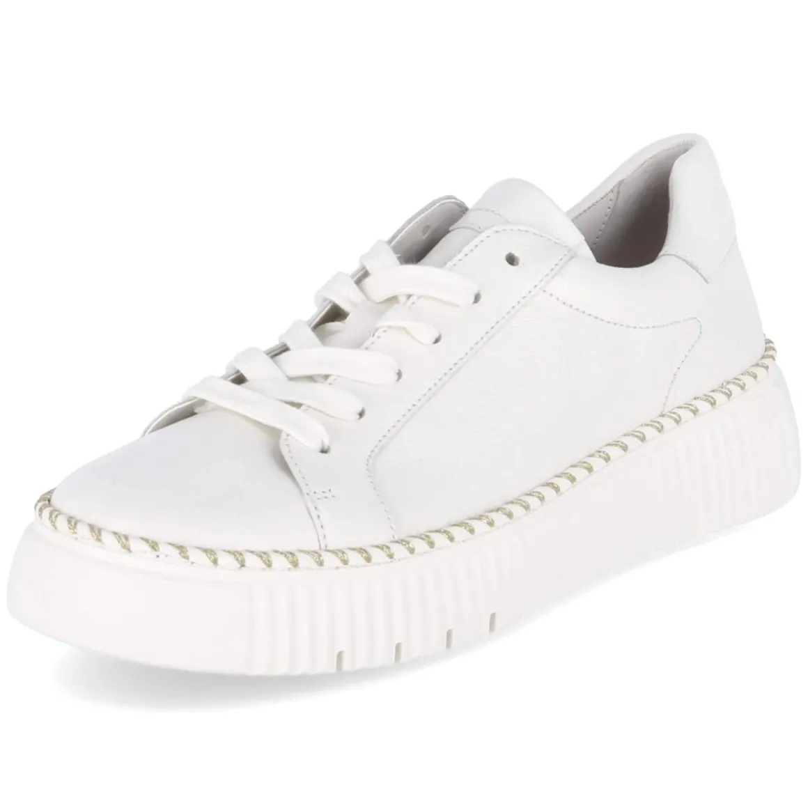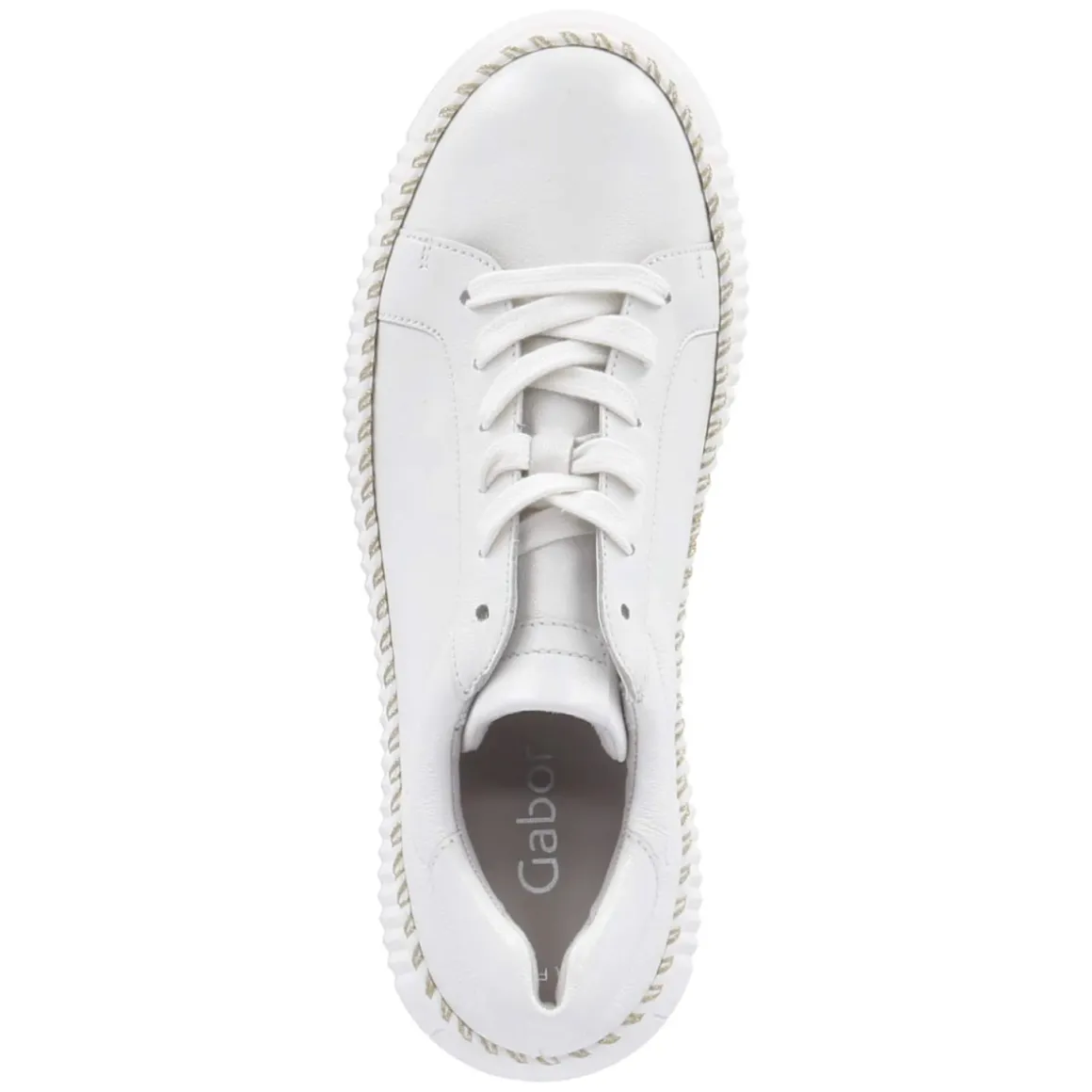 Der Low Sneaker von Gabor in klassischem Weiß verbindet zeitlose Optik mit durchdachten Komfortdetails. Langlebiges Glattleder prägt das Obermaterial, die runde Schuhspitze sorgt für eine angenehme Zehenfreiheit. Die 4 cm hohe Plateausohle verleiht eine dezente Höhe und unterstützt zugleich einen stabilen Auftritt. Eine rutschhemmende Laufsohle mit feiner goldener Naht setzt einen eleganten Akzent. Die Schnürung ermöglicht passgenauen Halt, unterstützt durch einen verstärkten Fersenbereich und einen weich gepolsterten Einstieg. Innen sorgt eine synthetische Decksohle zusammen mit dem gepolsterten, herausnehmbaren Wechselfußbett für entspanntes Tragegefühl – ideal auch für eigene Einlagen. Der Sneaker fällt normal aus und bietet vielseitige Kombinationsmöglichkeiten für den Alltag. Modetipp: Mit Cropped-Jeans und Trenchcoat entsteht ein moderner City-Look, zum Midikleid bildet der weiße Ton einen frischen, cleanen Kontrast.